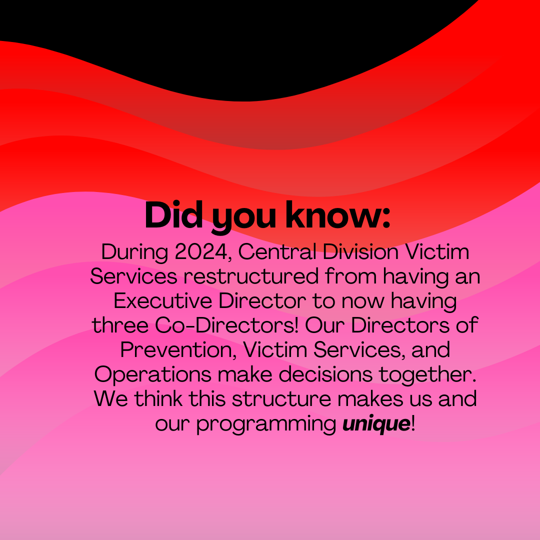 Happy New Year from all of us at Central Division Victim Services! As we step into this fresh start, we remain committed to supporting survivors and co-survivors in their journey toward healing and empowerment. This year, let's focus on building safer communities, fostering resilience, and creating meaningful change together.
