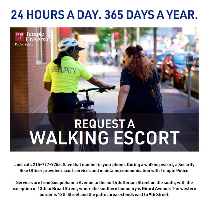 Walking escorts are available to accompany individuals to locations within Temple University's patrol boundaries. Escorts are security bike officers that maintain communication with Temple Police. Escort service is available daily. Below are the instructions to request an escort. Everyone please be safe. | |