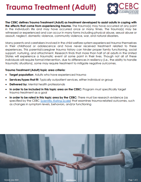 Many parents and caretakers involved in the child welfare system experienced trauma themselves in their childhood or adolescence and have never received treatment related to these experiences. The CEBC’s Trauma Treatment (Adult) topic area includes treatment developed to assist adults in coping with the effects that come from experiencing trauma. This brief overview of the topic highlights all programs within the Trauma Treatment (Adult) topic area, including 13 rated programs. View topic area summary.