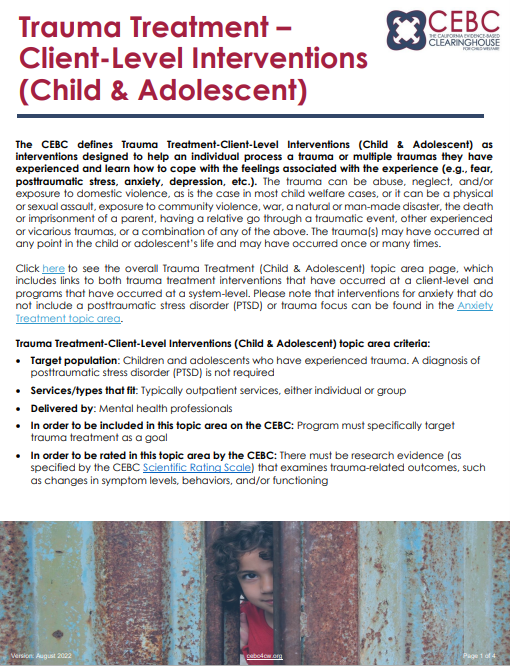 The CEBC’s Trauma Treatment – Client-Level Interventions (Child & Adolescent) topic area includes interventions designed to help an individual process a trauma or multiple traumas they have experienced and learn how to cope with the feelings associated with the experience (e.g., fear, posttraumatic stress, anxiety, depression, etc.). This brief overview of the topic highlights all programs within the Trauma Treatment – Client-Level Interventions (Child & Adolescent) topic area, including 24 rated programs. View topic area summary.