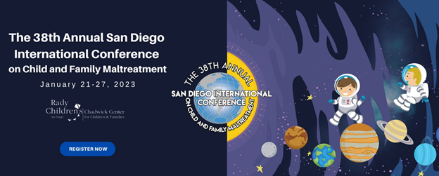 The 38th Annual San Diego International Conference on Child and Family Maltreatment hosted by the Chadwick Center is scheduled for January 21–27, 2023. Designed to provide education and connection opportunities for professionals in the field of child maltreatment and trauma, topic highlights for this coming year’s conference include the intersection of trauma-informed care and racial justice, addressing secondary traumatic stress and burnout in the workforce, leadership strategies to support staff, and many more!