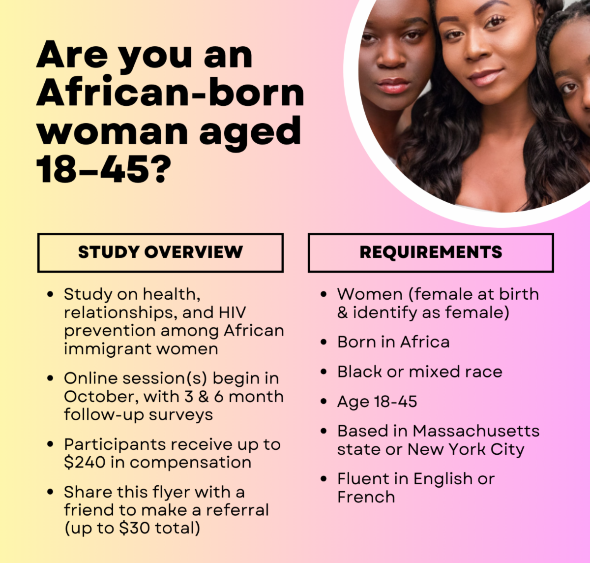 The PCORI study focuses on HIV-AIDS in African-born female populations in the U.S. Held at Whittier Street Health Center, the study is a Randomized Controlled Comparative Effectiveness Trial which is in collaboration with Brigham and Women’s Hospital and Muslim Women’s Institute of Research and Development based in New York. The current aim of this study is to determine the effectiveness of adapted versions of Sister-to-Sister which is an individual intervention versus SISTA (Sisters Informing Sisters About Topics On AIDS) which is a group-level intervention on increasing condom use and PrEP (Pre-Exposure Prophylaxis) uptake among African‐born women.