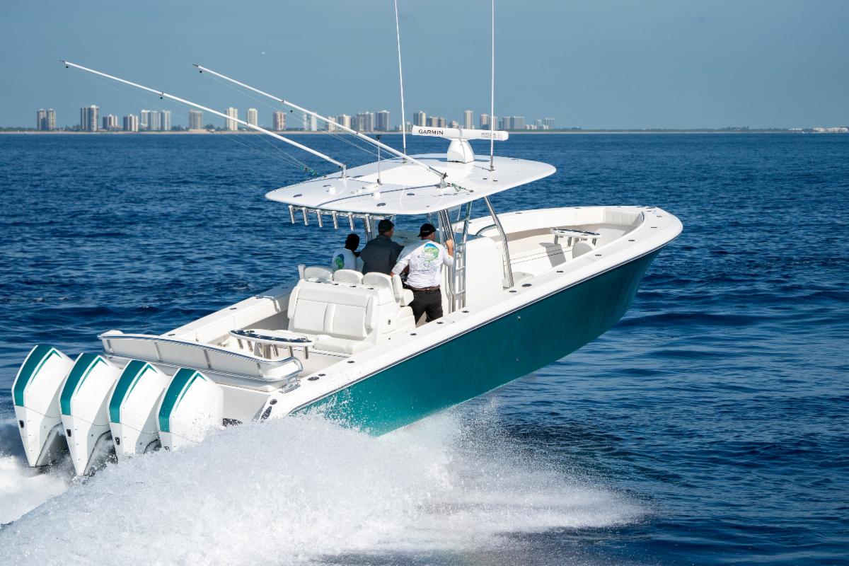 The 41GT takes everything you love about the original and turns it up. Think of it as the 41’s bolder, more powerful sibling—engineered with added lifestyle features and a beefier structure (18,000 lbs). With upgraded horsepower capacity (up to 2000 HP), dual-row helm seating, integrated sun shades, and an elegant console design, the GT brings added versatility without compromising on fishability.