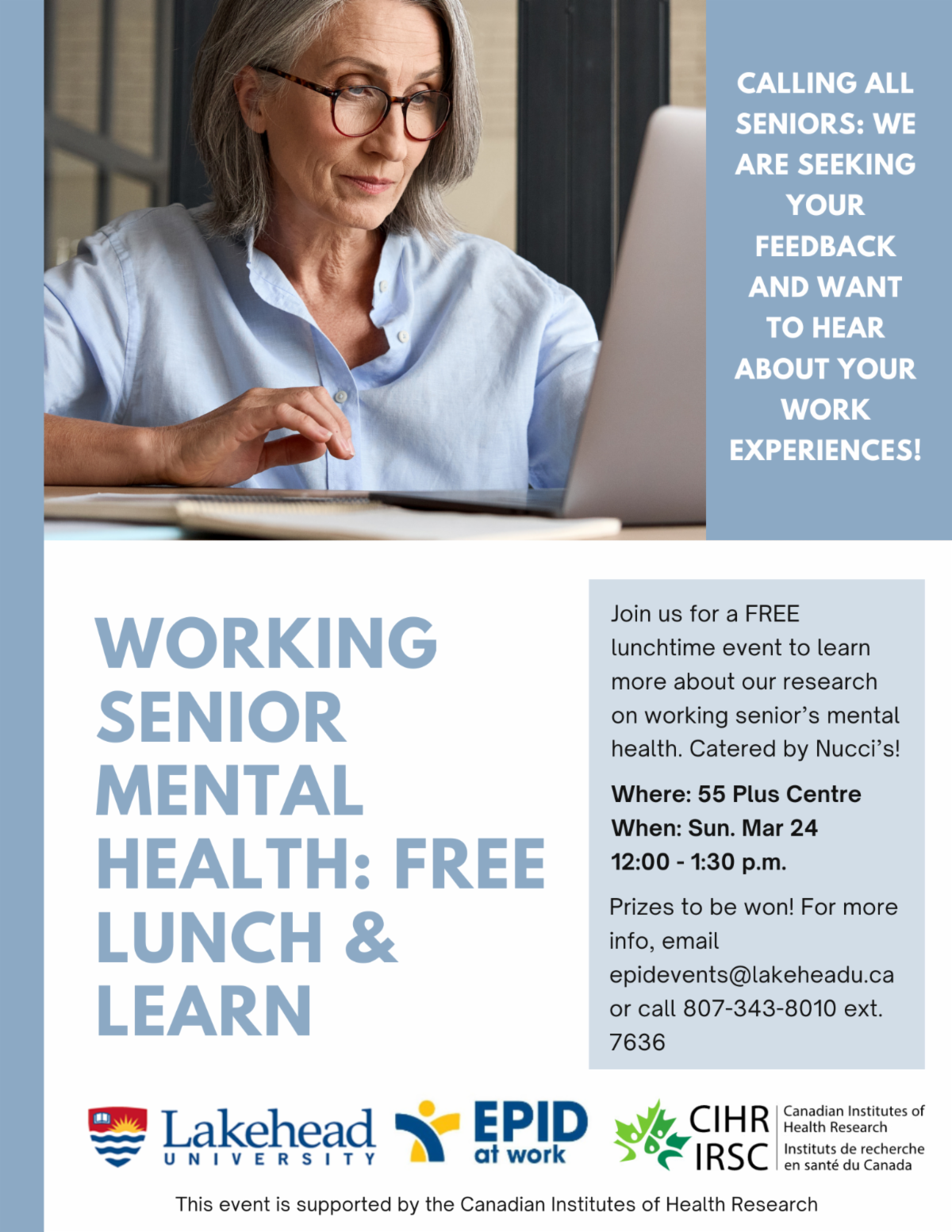 EPID@Work Research Institute is hosting a FREE lunch & learn event to share our research about working seniors’ mental health. Dr. Batholomew Chireh will be presenting the findings from his research: “Mental health of working seniors in Canada: prevalence, determinants and lived experiences.”