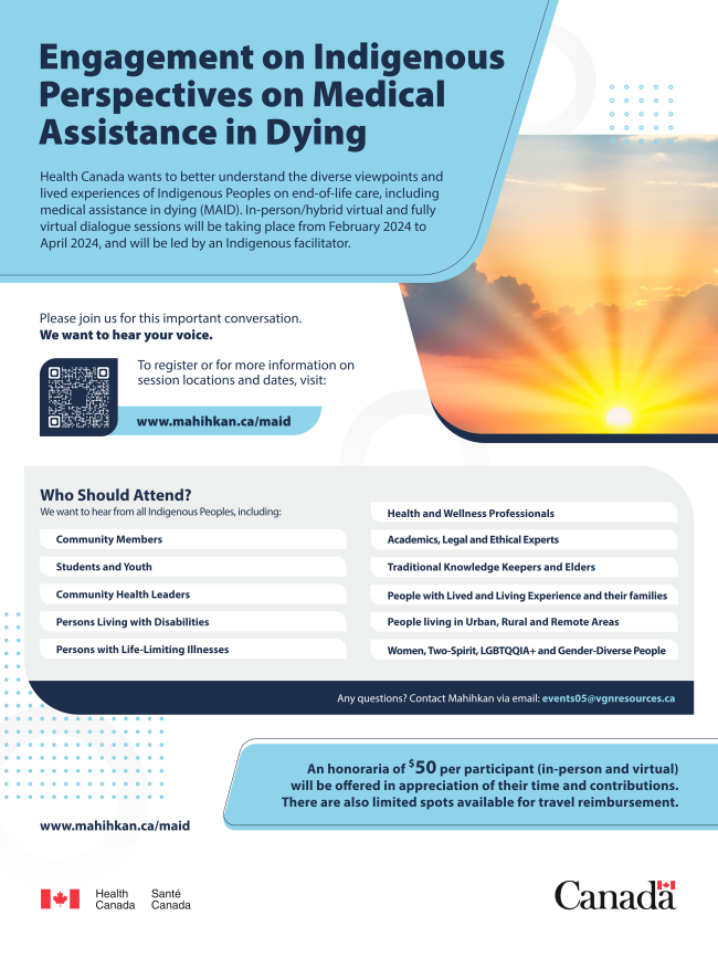 Health Canada wants to better understand the diverse viewpoints and lived experiences of Indigenous Peoples on end-of-life care, including MAiD. In-person/hybrid virtual and fully virtual dialogue sessions will be taking place from February 2024 to April 2024, and will be led by an Indigenous facilitator.