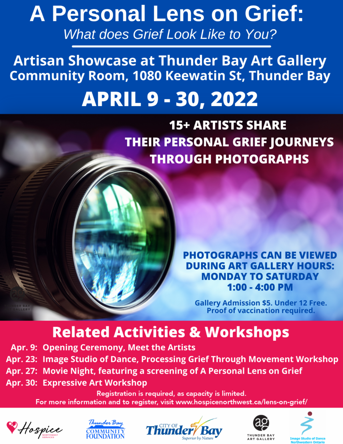 Visit the Thunder Bay Art Gallery between April 9-30 to view artist submissions collected by Hospice Northwest. Also, check out the related activities and workshops. By sharing our grief experiences and feelings through pictures, we can encourage discussion, collaborate for change and build a community of support.