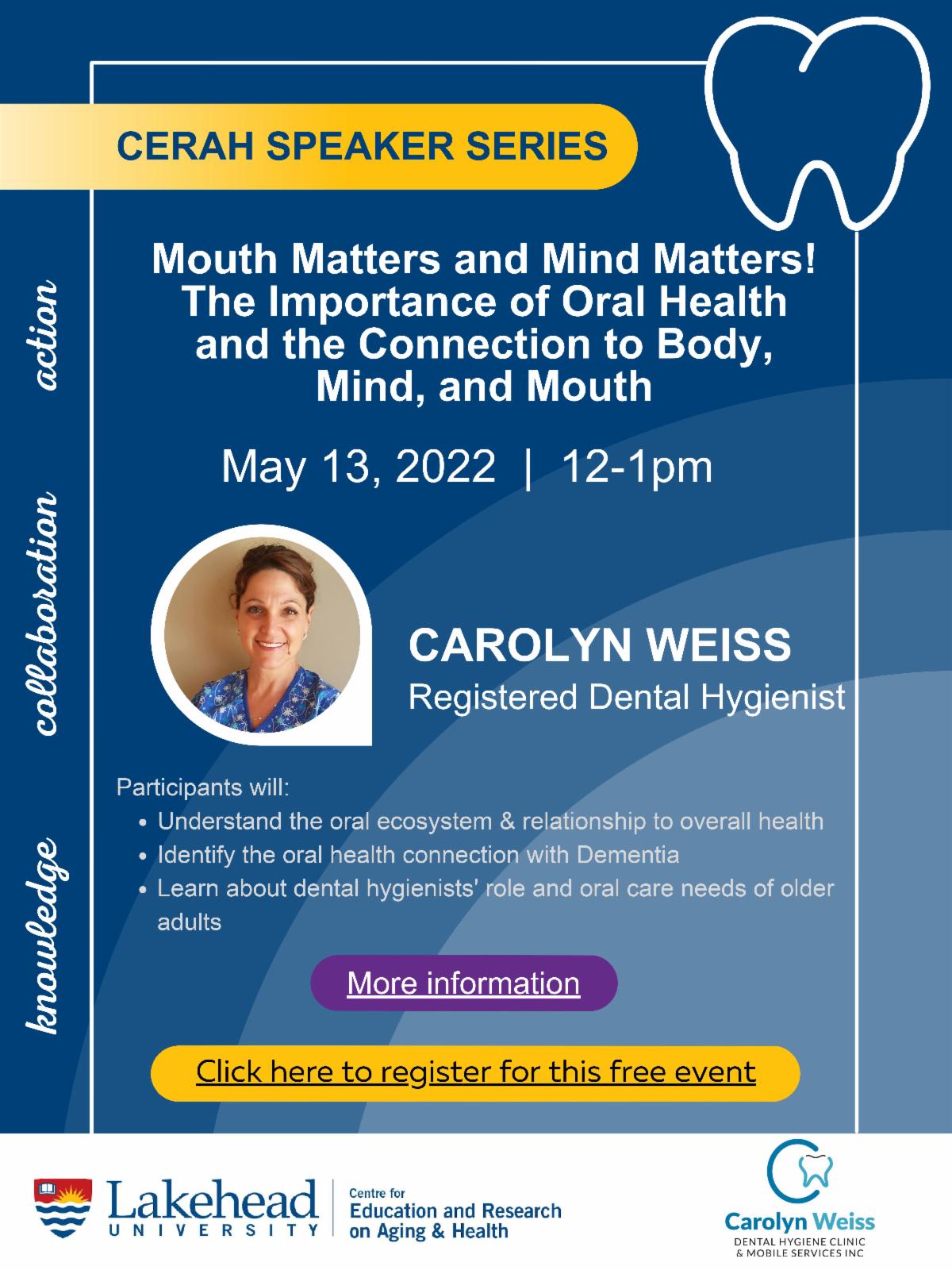 Join us for a presentation “Mouth Matters and Mind Matters! The Importance of Oral Health and the Connection to Body, Mind, and Mouth” by Carolyn Weiss of Carolyn Weiss Dental Hygiene Clinic.