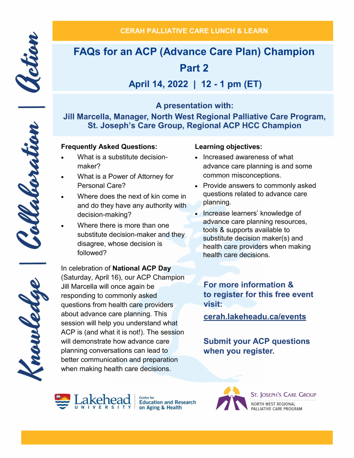 In celebration of National ACP Day, Regional ACP Champion Jill Marcella will once again be responding to commonly asked questions from health care providers about advance care planning. Join us to learn more about substitute decision-making, power of attorney for personal care, and how to navigate complex scenarios.