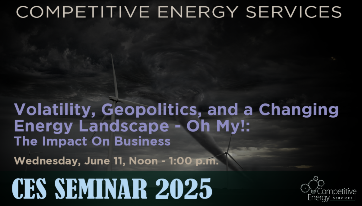 Register to attend Competitive Energy Services’ free online energy market seminar, titled “Volatility, Geopolitics, and a Changing Regulatory Landscape – Oh My!: The Impact on Business,” which will be held on Wednesday, June 11 from Noon – 1:00 p.m. (including Q&A) and join CES Energy experts who will be on hand that day to cover top-of-mind energy topics, including: