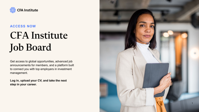 The CFA Institute Job Board, presented by CFA Society Stamford gives exclusive member access to global opportunities, early job alerts, and a platform built to connect you with top employers in the investment industry. Log in, upload your CV, and take the next step in your career