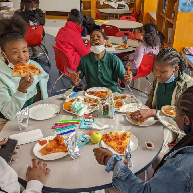 Sixth grade students at Franklin Square Elementary/Middle School share pizza and work on their CFCC Art Contest entries.