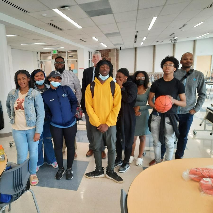 Spring 2022 TCP graduates at the Academy for College and Career Exploration with volunteer TCP Judge David Fishkin, TCP Restorative Practices Intern Chris Kelly, and ACCE School Community Coordinator Pierre Sanders.