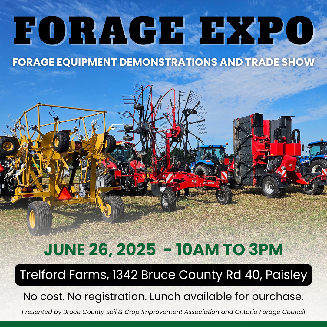 OFC and Bruce County Soil & Crop Improvement Association are pleased to announce that Forage Expo will happen in Bruce County this year. The event will be held on June 26, 2025 from 10 a.m. to 3 p.m. at Craig Trelford and family’s Trelford Farms, 1342 Bruce County Rd 40, Paisley.