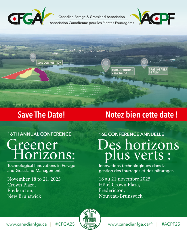 As we approach the warmer months, excitement is building for our 16th annual conference, taking place in Fredericton, New Brunswick, Nov. 18 to 21. This year’s theme is Greener Horizons: Technological Innovations in Forage and Grassland Management. The event will focus on advancing sustainable practices in forage and grassland management through cutting-edge technology and will highlight innovations that improve soil health, biodiversity and carbon sequestration while enhancing productivity for farmers and land managers. We encourage you to stay connected with us through our website and social media channels. Your involvement and support are key to shaping a thriving future for Canadian agriculture.