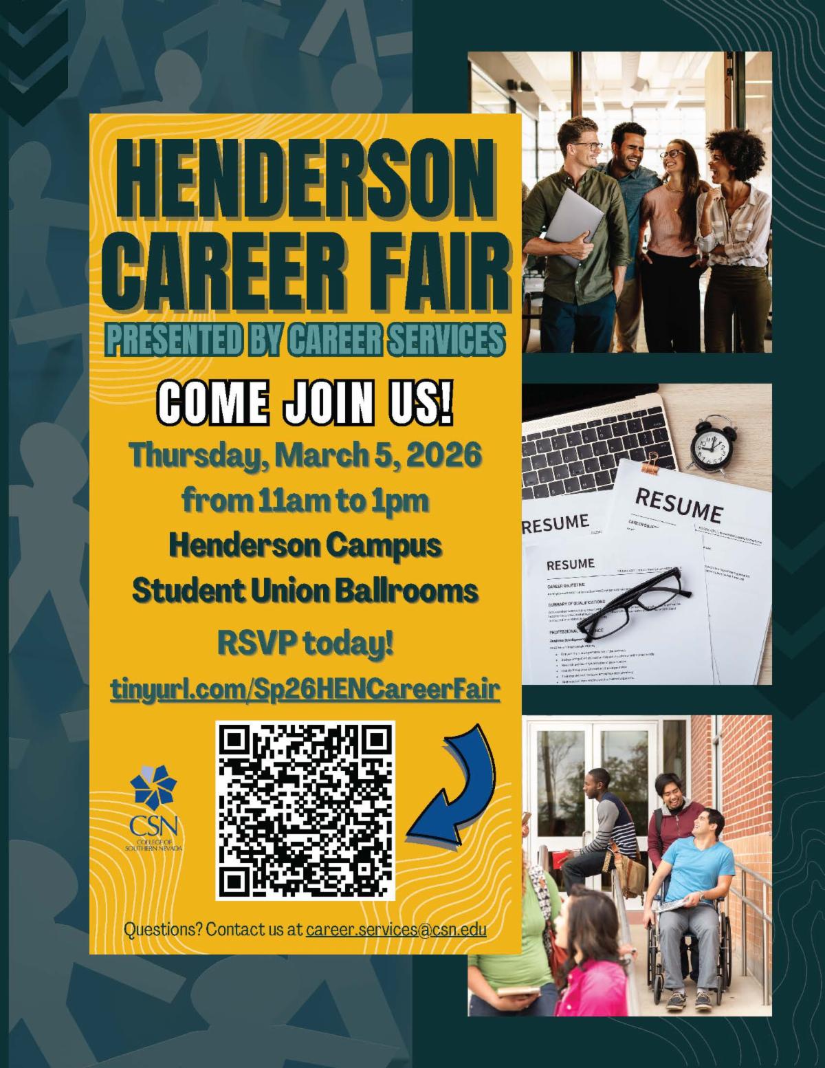 Join CSN's Career Services Center on Thursday, March 5th for a career fair at the CSN Henderson campus! This is a great opportunity for high school seniors to preview possible job options and career pathways. RSVP today using the code on the flyer!