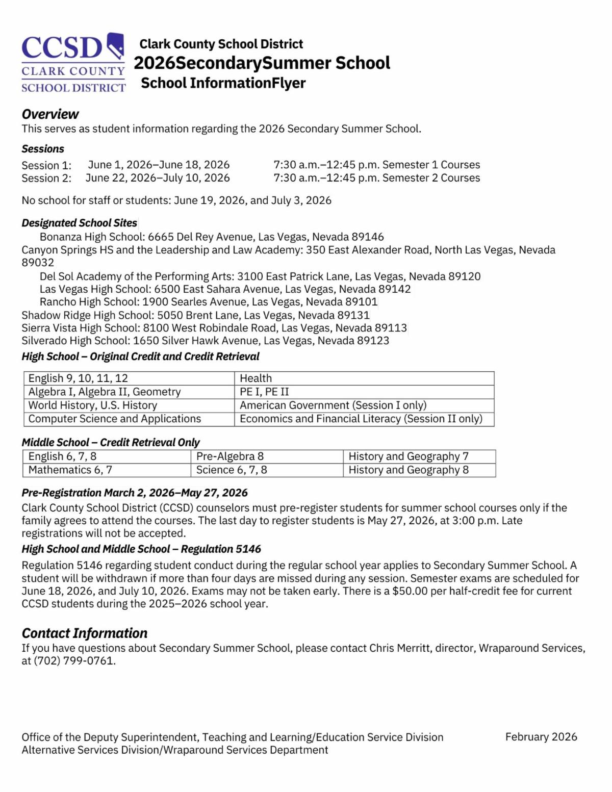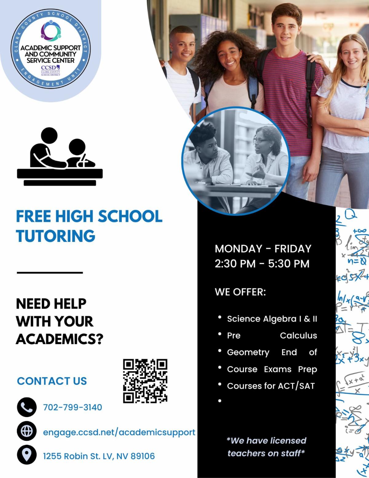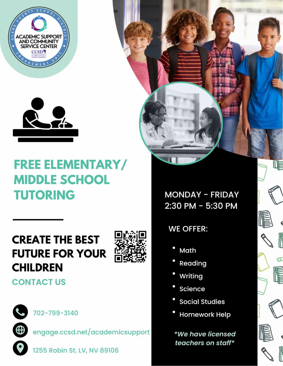 | | | Could your child benefit from additional academic support? CCSD's Academic Support and Community Service Center offers free tutoring for all grade levels! No matter if your student needs help with math, science, reading, writing, or end-of-semester test prep, the licensed teachers at the Academic Support and Community Service Center can help. Click the button for more info! | | | | |