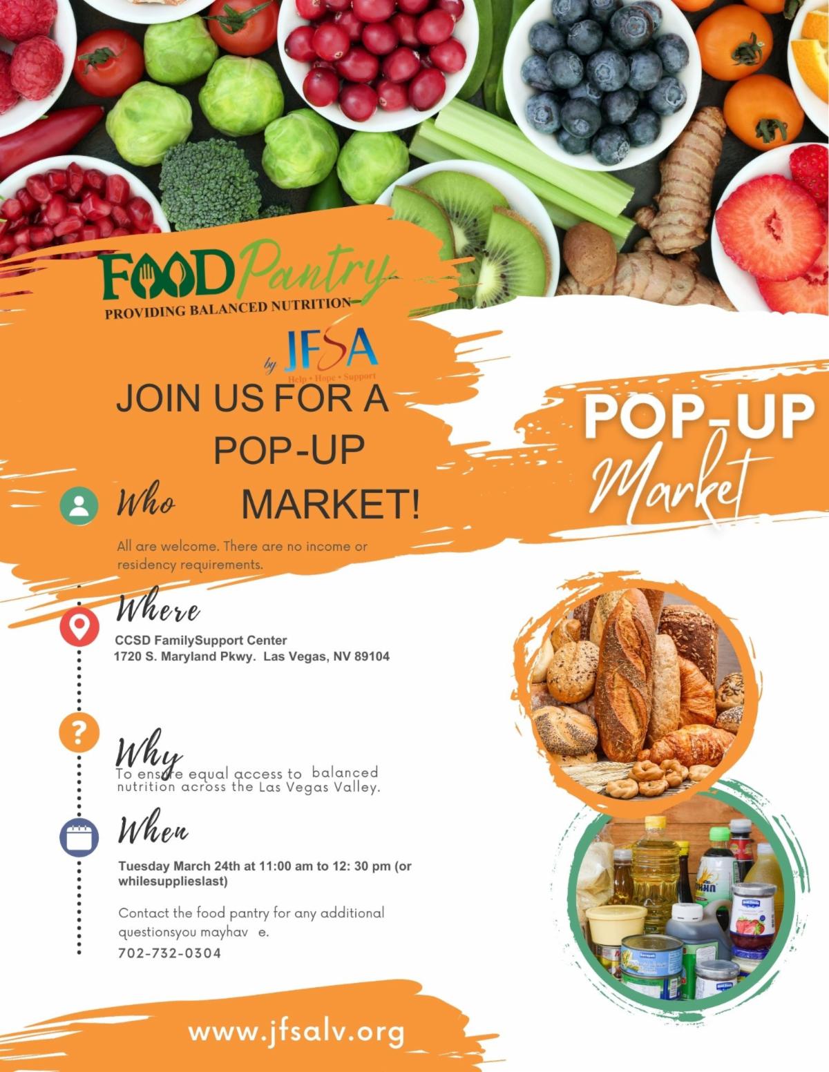 Come on down to the Central Family Support Center for free food on Tuesday, March 24th! The JFSA Pop-up Market will be in the parking lot from 11:00 a.m. until 12:30 p.m. or while supplies last. There are no income or residency requirements; all are welcome to participate.
