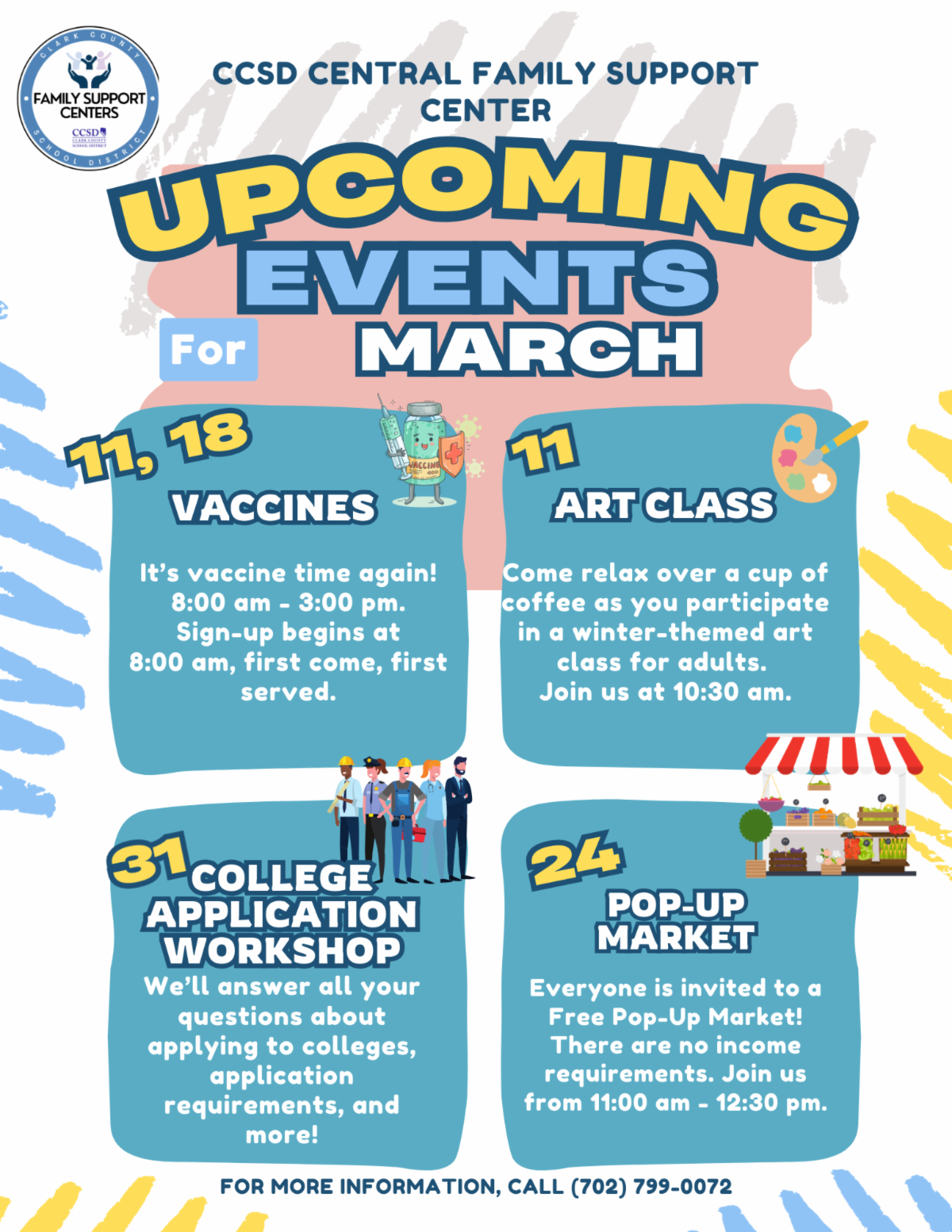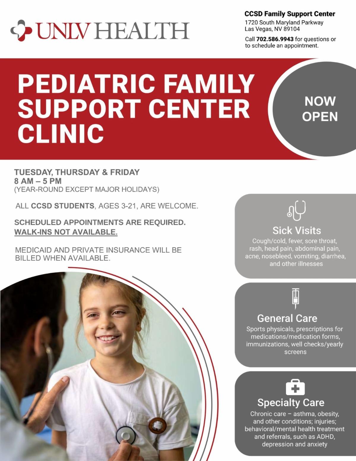 If your child needs healthcare, check out the UNLV Health Clinic located in the same building as the Central Family Support Center! Whether you need a physical, acute care, a prescription, mental health treatment, immunizations, referrals, and more, the Pediatric Family Support Center Clinic is here. Please bring your insurance information if you have it. Walk-ins are NOT available, so please call 702-586-9943 to make an appointment.