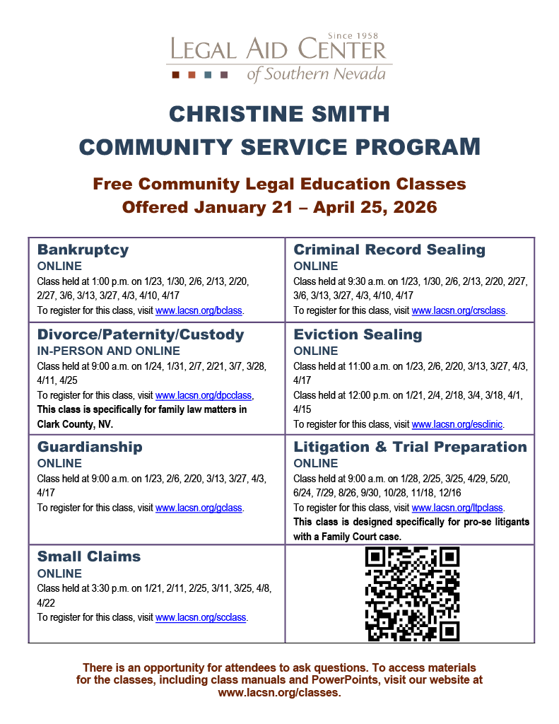 The Christine Smith Community Services Program is offering free community legal education classes. Most classes are online, and topics include bankruptcy, criminal record sealing, divorce and custody, guardianship, small claims and more.
