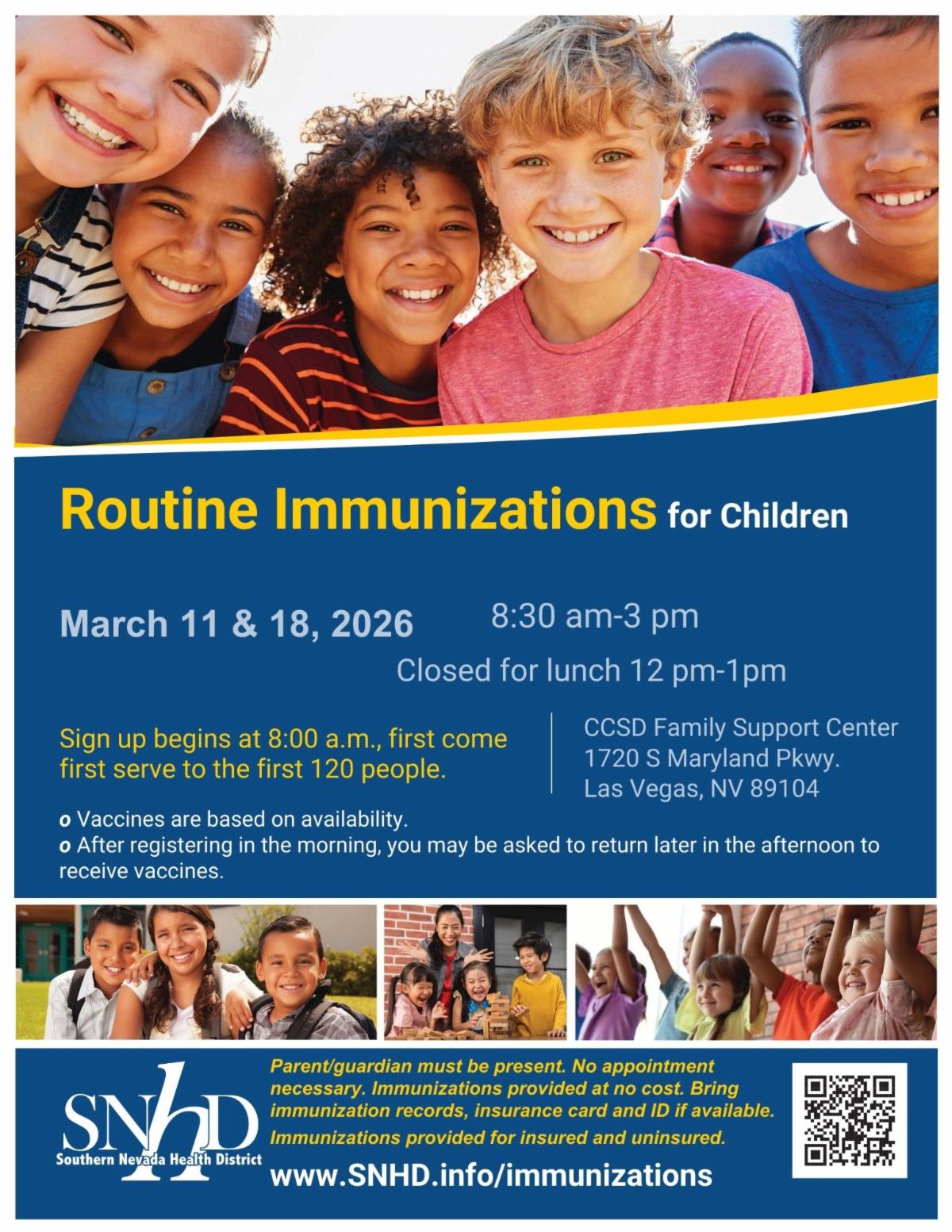 CCSD requires that all students be up-to-date on their vaccines. Grab your child's shot records and head down to the FSC on March 11th or 18th. A parent or guardian must be present, and while insurance will be billed if you have it, there is no cost for vaccines. See you there!