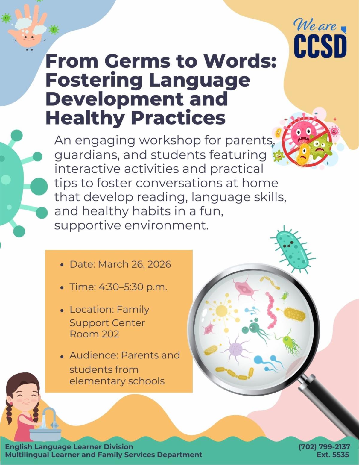 If your student is in elementary school, check out the newest language workshop from CCSD's English Language Learner division! This engaging workshop will feature interactive activities, practical tips, and fun strategies to foster reading skills, language acquisition, and healthy habits in an enjoyable, supportive environment.