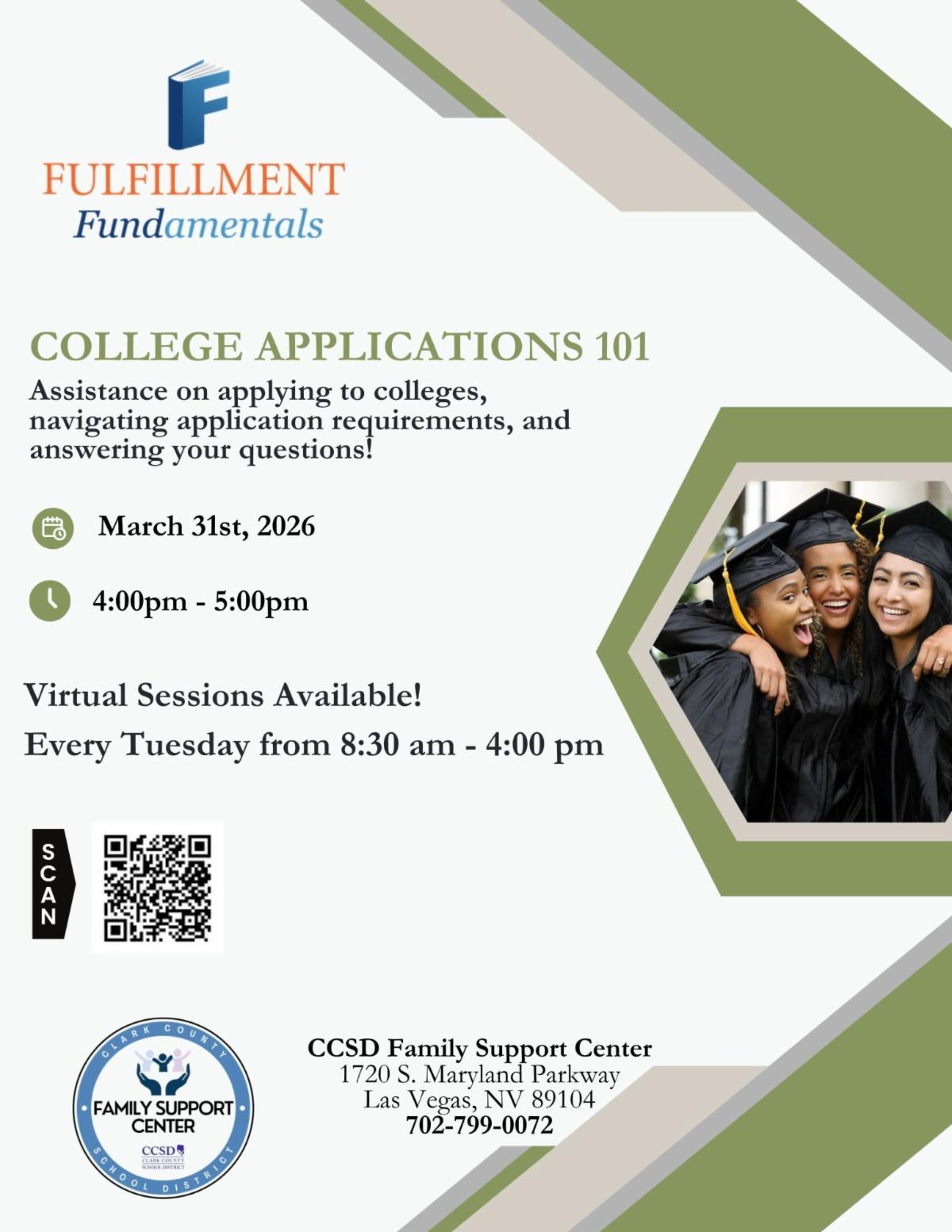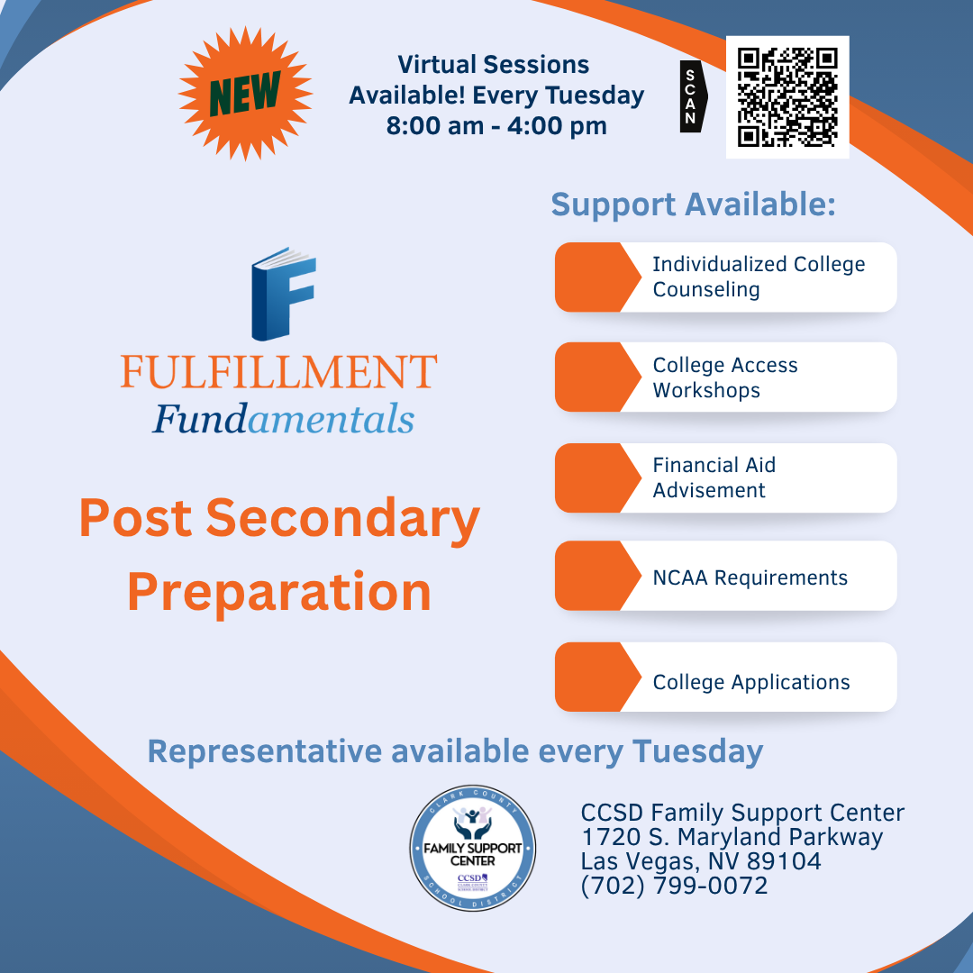 If you have questions about college, log into the Fulfillment Fundamentals post-secondary prep office hours every Tuesday between 8:00 a.m. and 4:00 p.m. They can provide individualized college and financial aid counseling as well as help with NCAA requirements and college applications. Scan the QR code on the flyer to learn more!