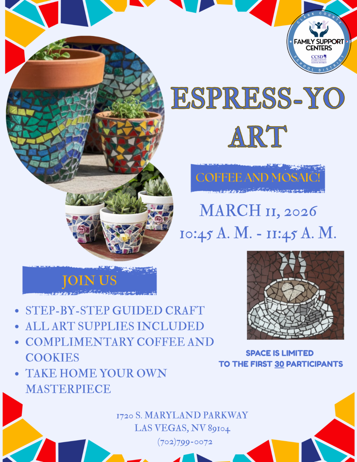 Come to the Central Family Support Center on Wednesday, March 11th at 10:45 a.m. for a free arts and crafts session! We'll be making a gorgeous mosaic that you can take home. Space is limited to the first 30 participants, so be sure to arrive early!