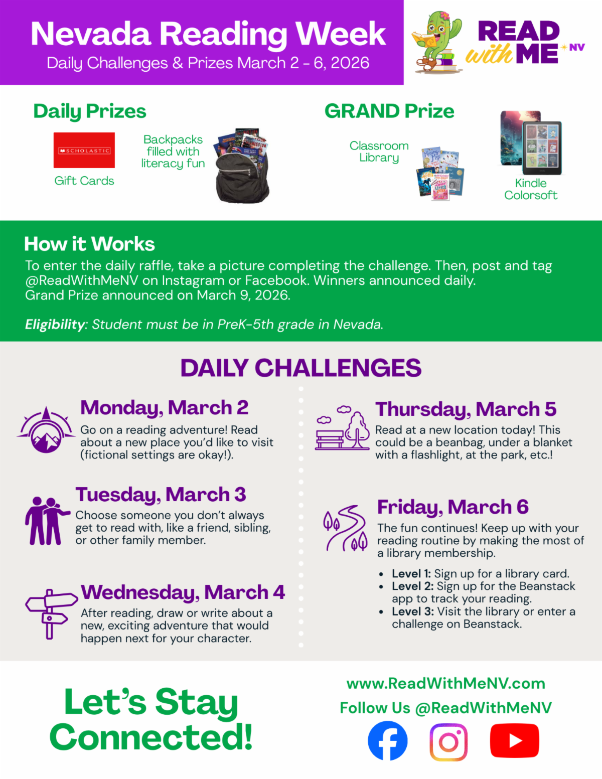 Start March off right with a week of fun reading challenges! Take and post a picture of yourself completing the challenge with the hashtag #ReadWithMeNV, and you'll be entered into the daily drawing for prizes with a grand prize to be drawn on Monday, March 9th. This is a great opportunity to make reading a part of your family!