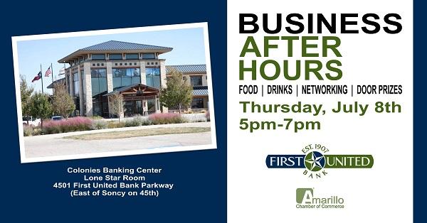 Join us for another FREE Business After Hours Networking Event on Thursday, July 8th from 5pm-7pm at First United Bank Amarillo at 4501 First United Bank Parkway just east of Soncy on 45th. There will be food, drinks, door prizes, and lots of networking with other business professionals.