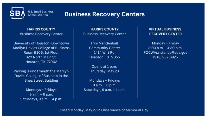 President Biden issued a disaster declaration which will enable assistance including grants for low-cost loans to cover uninsured property losses, and other programs to help individuals and business owners recover from the effects of the disaster. Also, the Office of Disaster Recovery and Resilience at the U.S. Small Business Administration announced the openings of two Business Recovery Centers located at the University of Houston – Downtown, Marilyn Davies College of Business and at Trini Mendenhall Community Center. For more information, visit the SBA website and the Chamber's Disaster Recovery page. | |