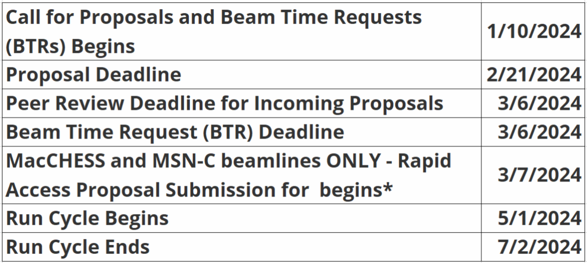 Please note, if you already have an active proposal in our BeamPASS, you can submit a new BTR until Wednesday, March 6, 2024. Proposals expire after two years. Please do not hesitate to reach out to the CHESS User Office if you need assistance with any of the submission processes.