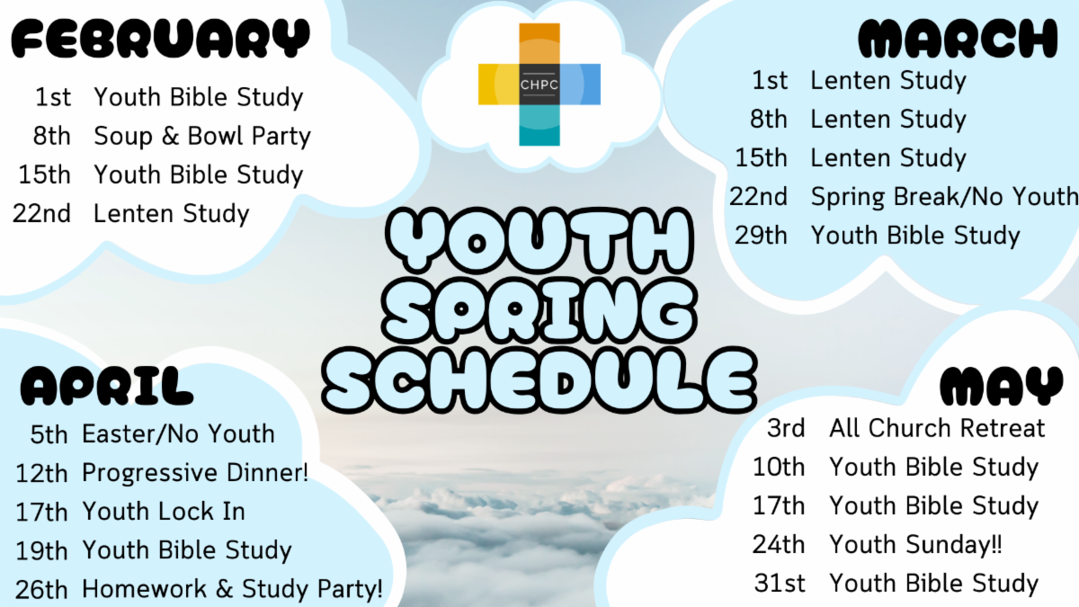 The days are getting longer, the weather is slowly but surely warming up, and winter is beginning to release its ice cold grip upon the world. Before we know it, spring will be here!! And for the CHPC Youth Group, the spring semester is already in full swing! As we begin this season of Lent, where we anticipate the coming of Easter, we have plenty of activities and opportunities for us to enjoy on our schedule. We hope that as we engage in this vital and vibrant ministry, that our church as a whole will keep us in your minds, hearts, and prayers.