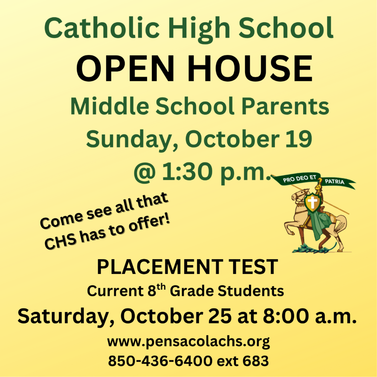 Catholic High will be hosting an Open House for any middle school parents who are thinking about sending their child to CHS on Sunday, Oct. 19, at 1:30 p.m. Please help us spread the word to any potential future CHS families.