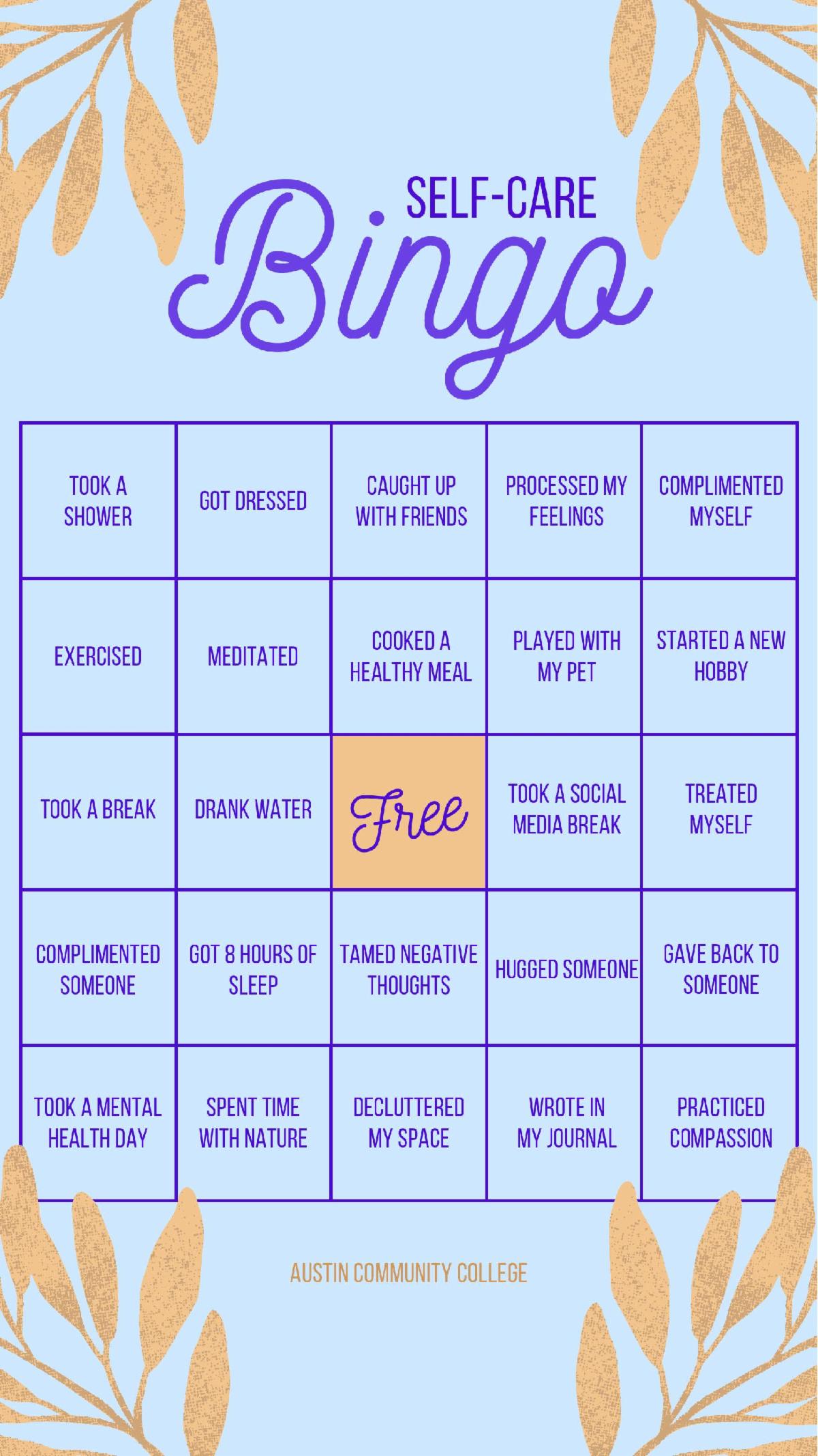 No hace falta decir que todos hemos tenido mucho en nuestro plato durante el año pasado. Su estudiante ha trabajado arduamente para superar varios obstáculos y, con el verano en el horizonte, también debería serlo un merecido cuidado personal. El cuidado personal puede parecer diferente para todos, pero el objetivo general es hacer algo que te haga sentir rejuvenecido. Adjunto puede encontrar un ejemplo de bingo de autocuidado para darle a su estudiante (oa usted mismo porque también ha trabajado duro). Esperamos que al marcar estas actividades en la tarjeta de bingo, se rejuvenezcan a sí mismos y a quienes los rodean.