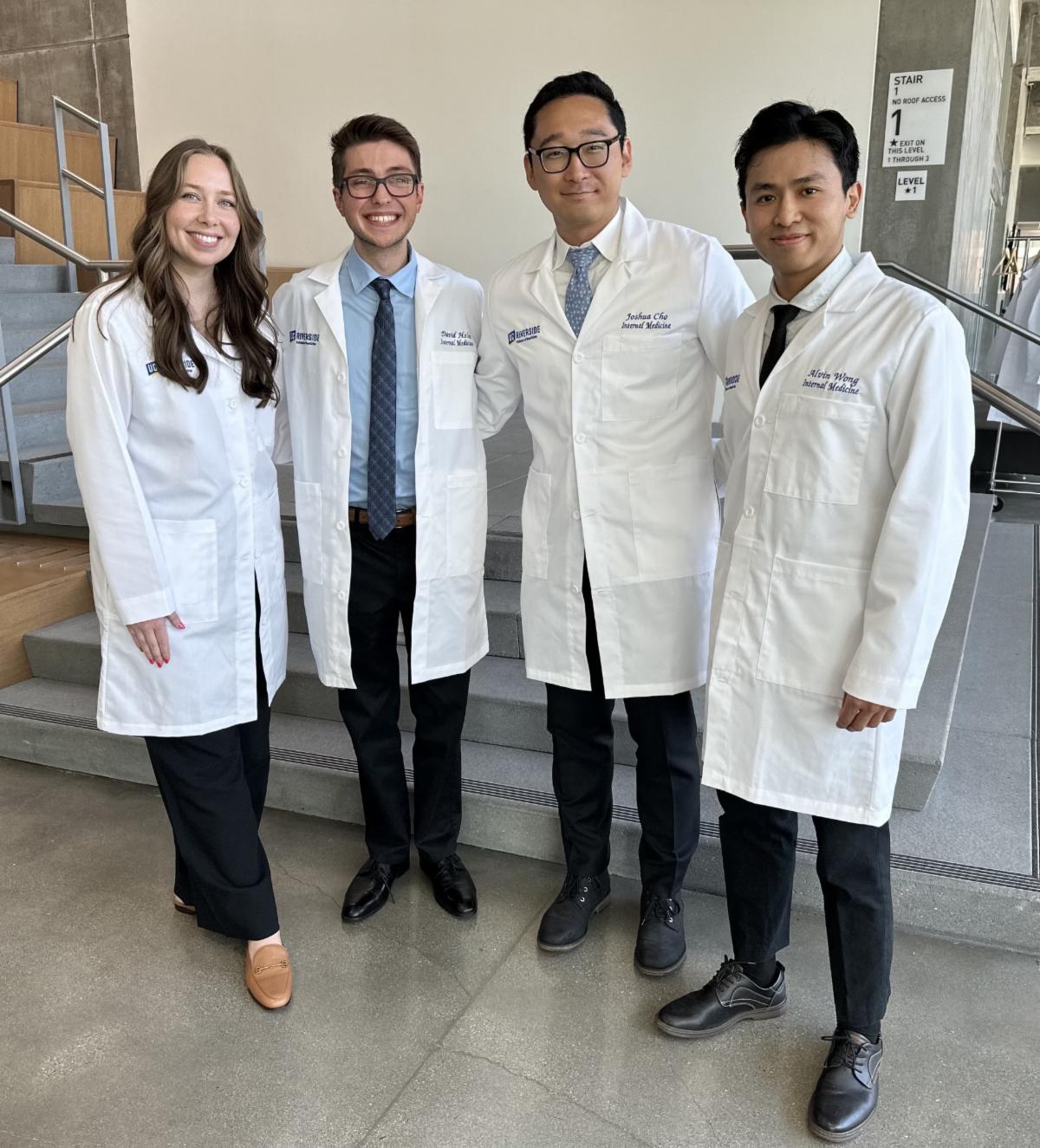 CHSU Class of 2025 alumni Megan Holm, DO; David Holm, DO; Joshua Cho, DO; and Alvin Wong, DO on their first day of Internal Medicine Residency at UC Riverside.