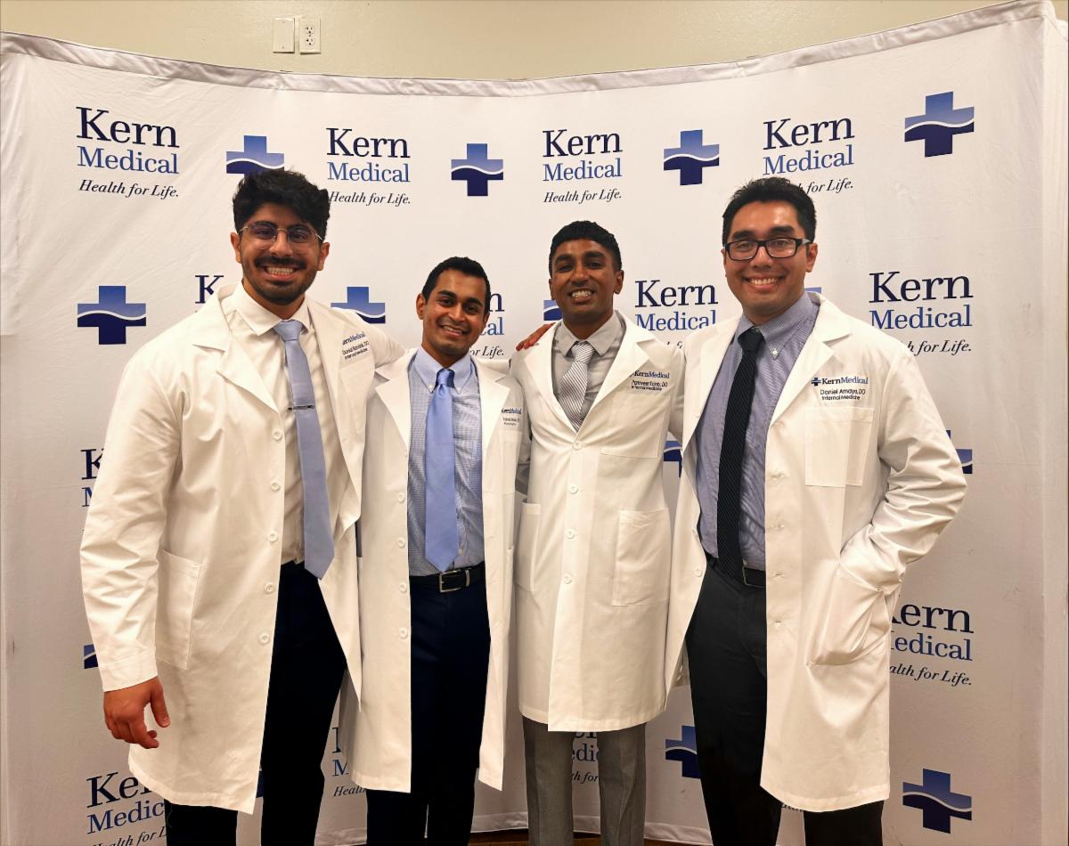 CHSU Class of 2025 alumni Fahad Molla, DO; Daniel Bandak, DO; Parmveer Kaloty, DO; and Daniel Amaya, DO at their white coat ceremony for the Kern Medical residency programs, including Psychiatry and Internal Medicine.