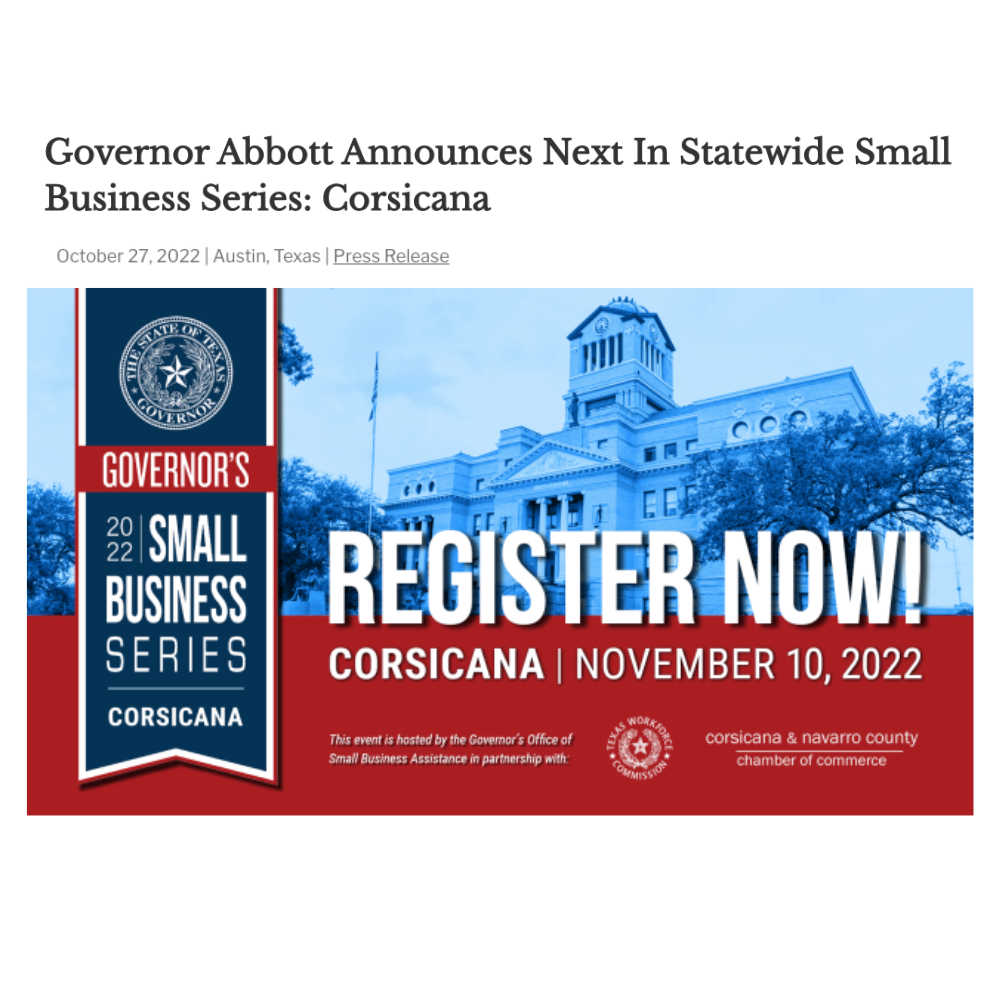 Governor Greg Abbott today announced the next in the statewide Governor’s Small Business Series to be held in person in Corsicana on Thursday, November 10.