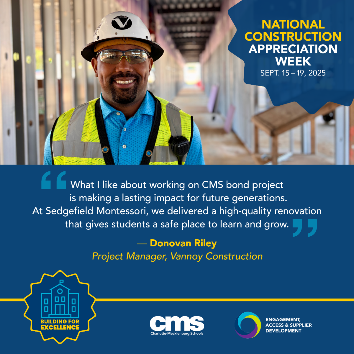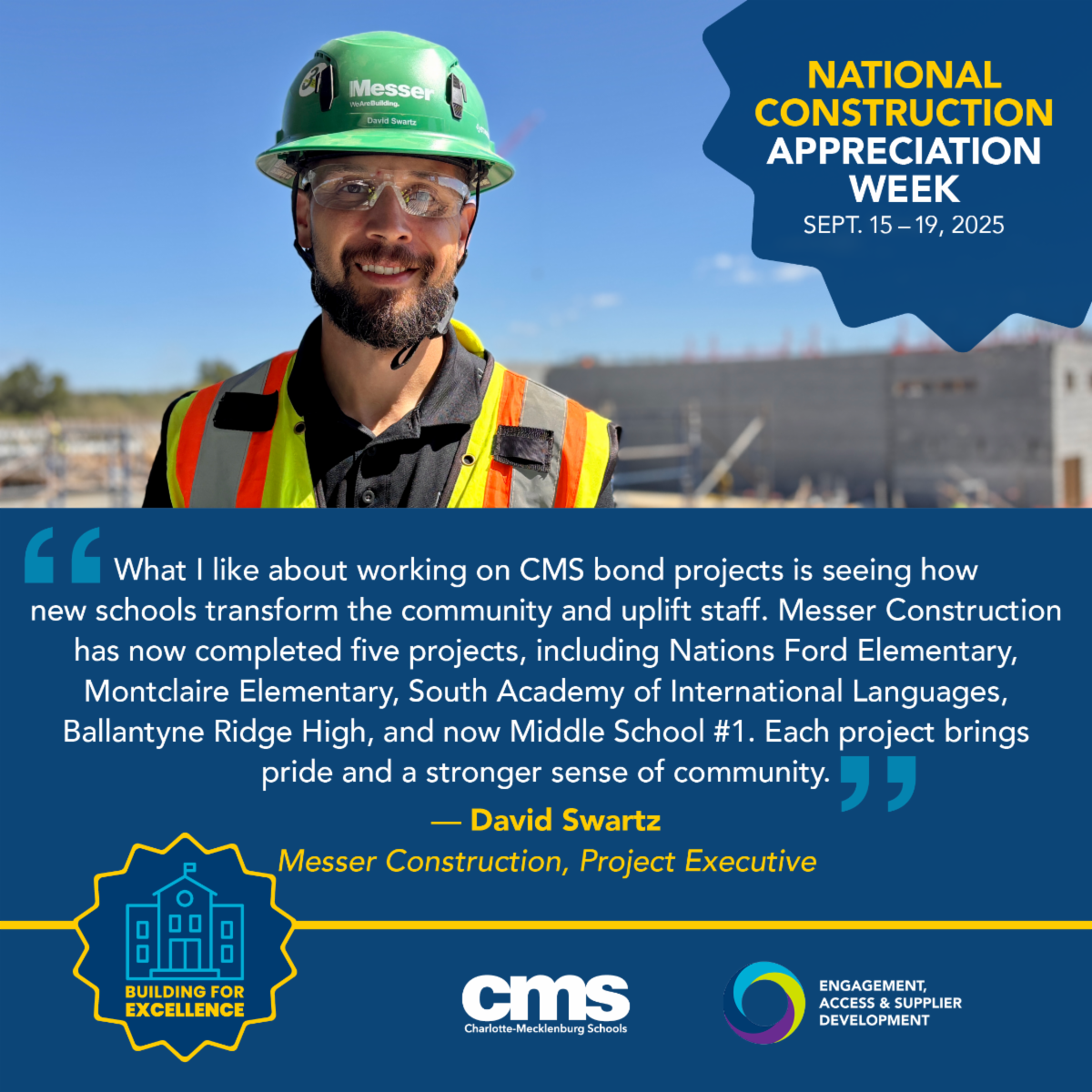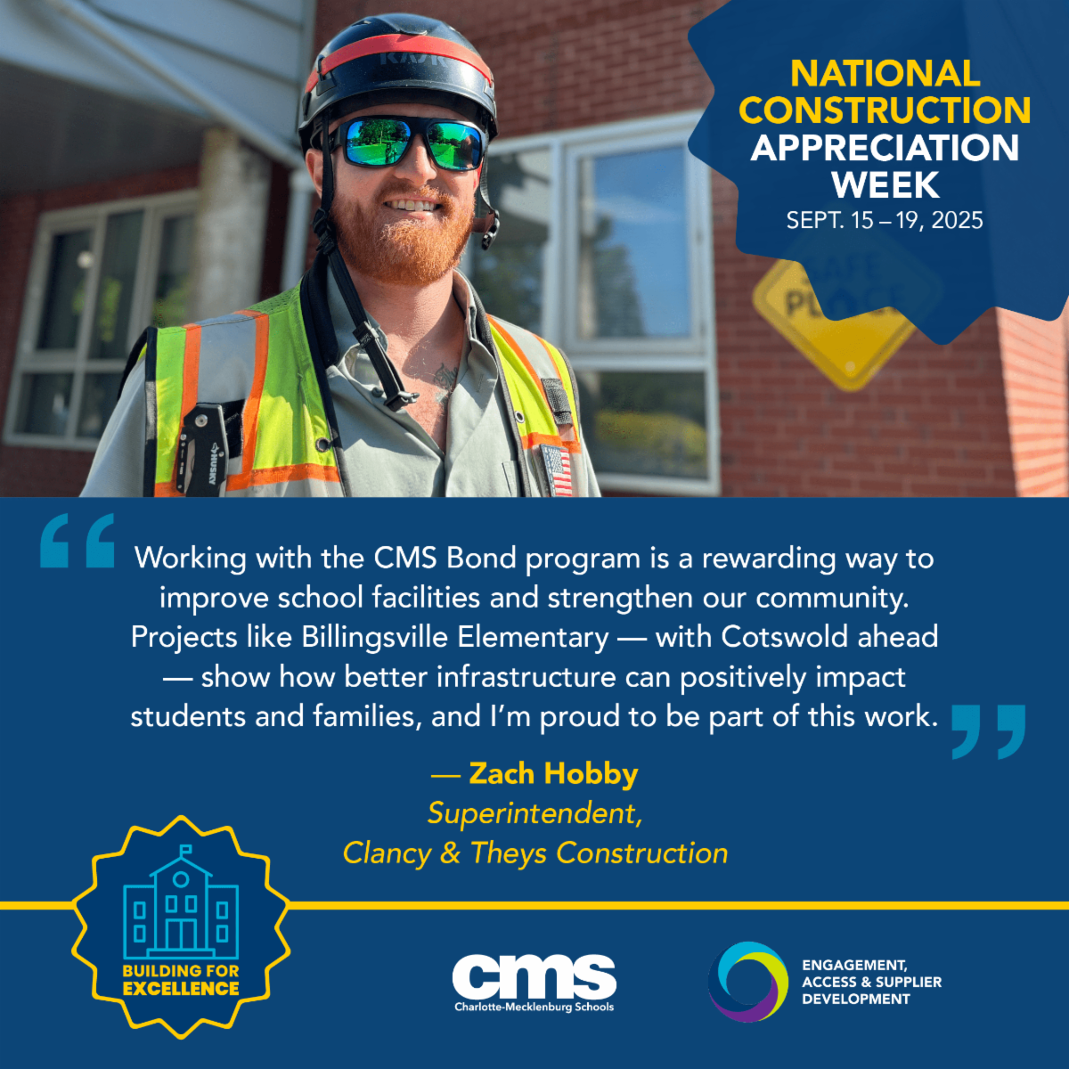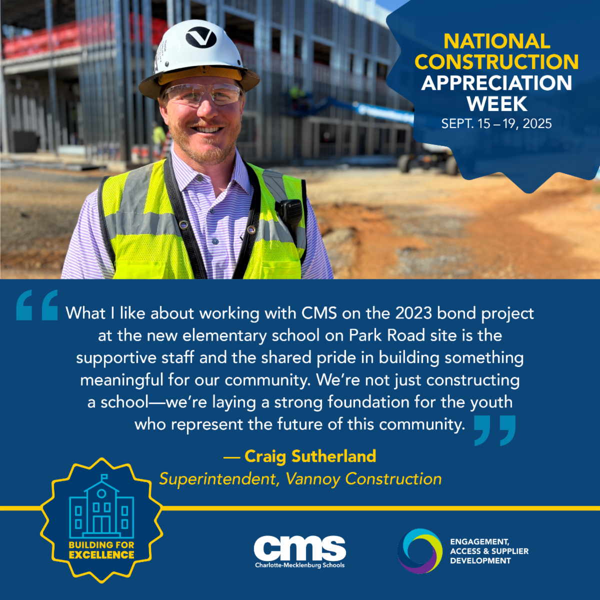 From Sept. 15-19, we celebrated National Construction Appreciation Week by thanking our construction managers and their teams for the pride and dedication they bring to the CMS 2023 bond projects. They shared how meaningful it is to work with Charlotte-Mecklenburg Schools, knowing their efforts create safe, innovative learning spaces for students, staff and families for generations to come.