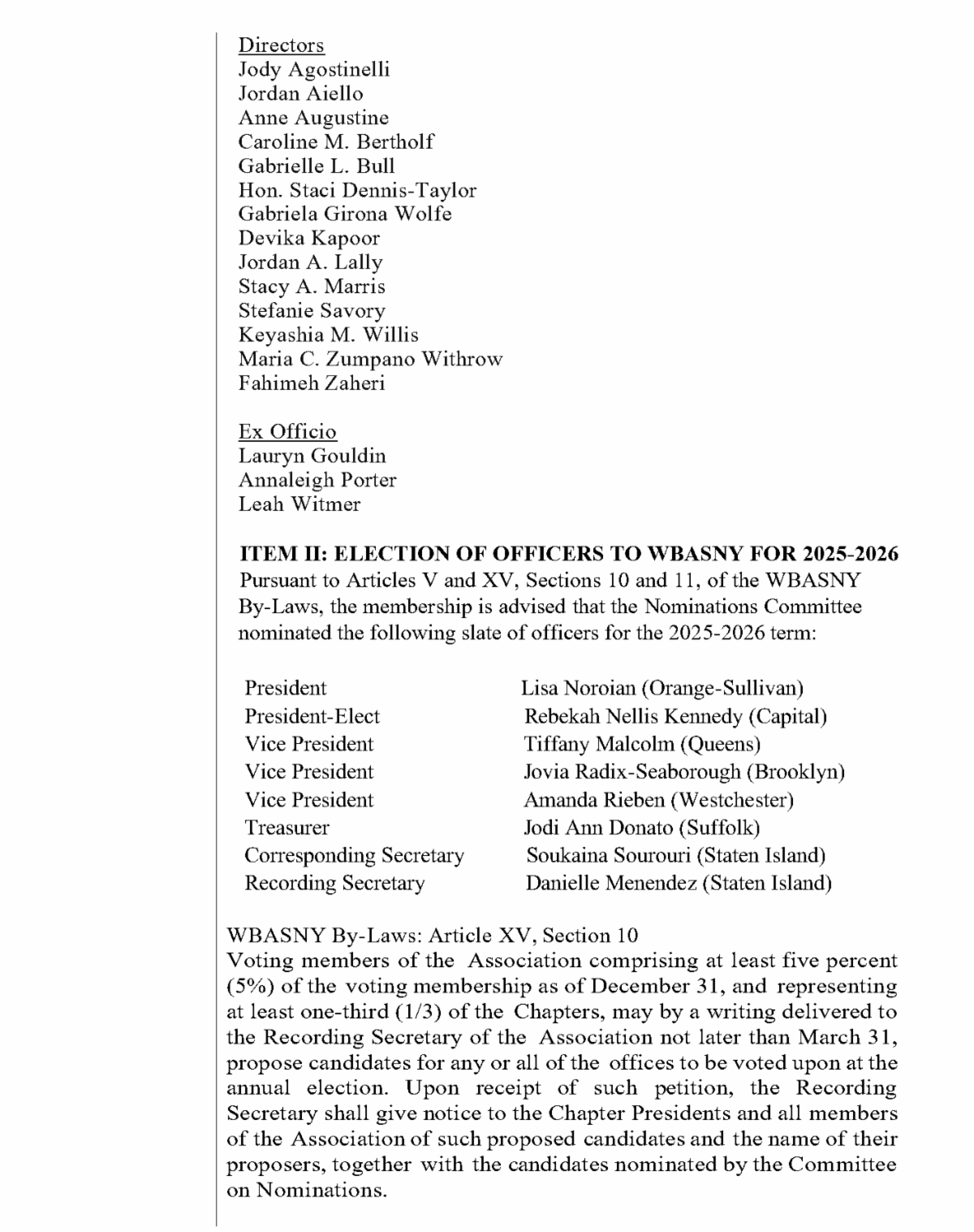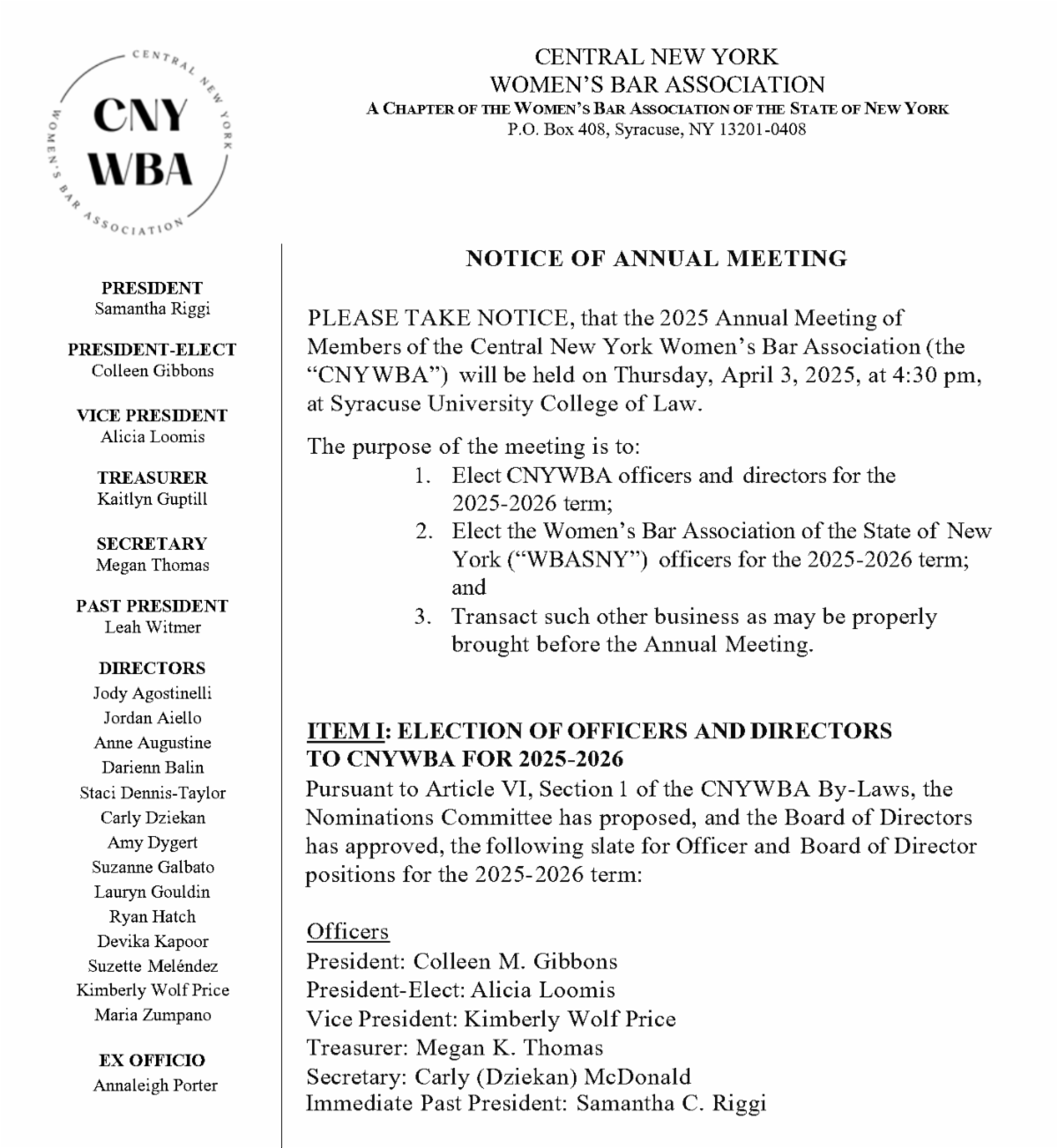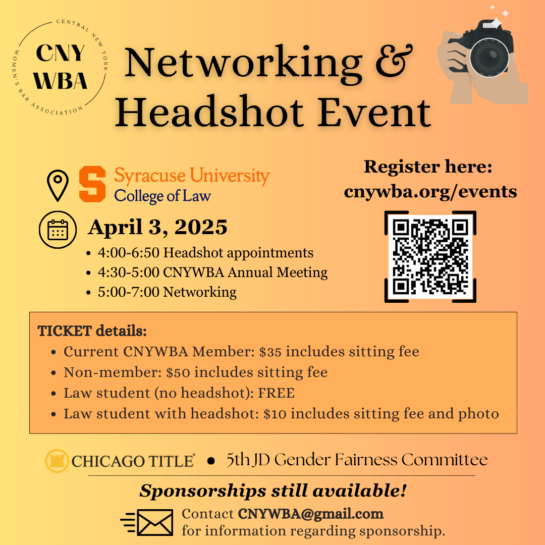 CNYWBA members will vote to approve the slate at our Annual Meeting on April 3, from 4:30-5:00pm at Syracuse University College of Law, to be followed by the Networking & Headshot Event.