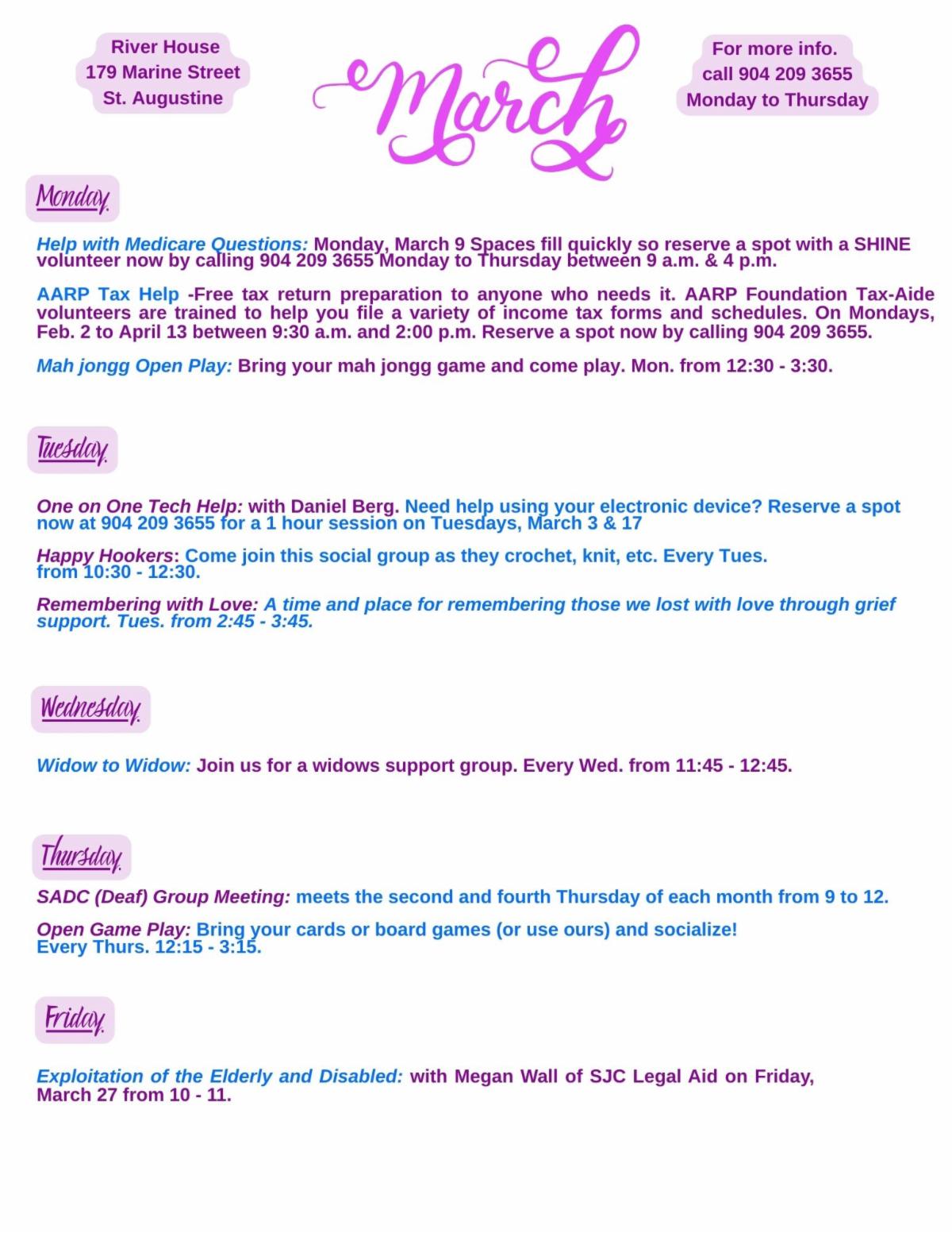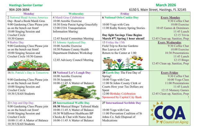 Sunshine Center (Assistant)–Volunteer needed at our Sunshine Center in Downtown St. Augustine. Duties include assisting staff with activities, serving lunches, cleaning up, and assisting a legally blind person with feeding and some activity interactions. This opportunity is available on Fridays 8:30am-11:30am. This is a great way to show dignity and respect to our seniors.