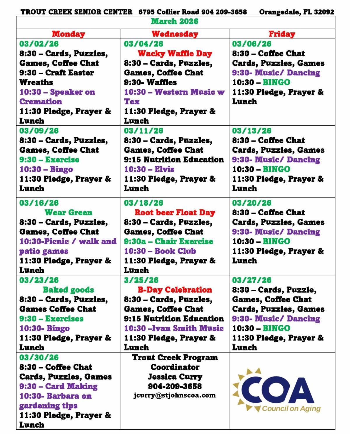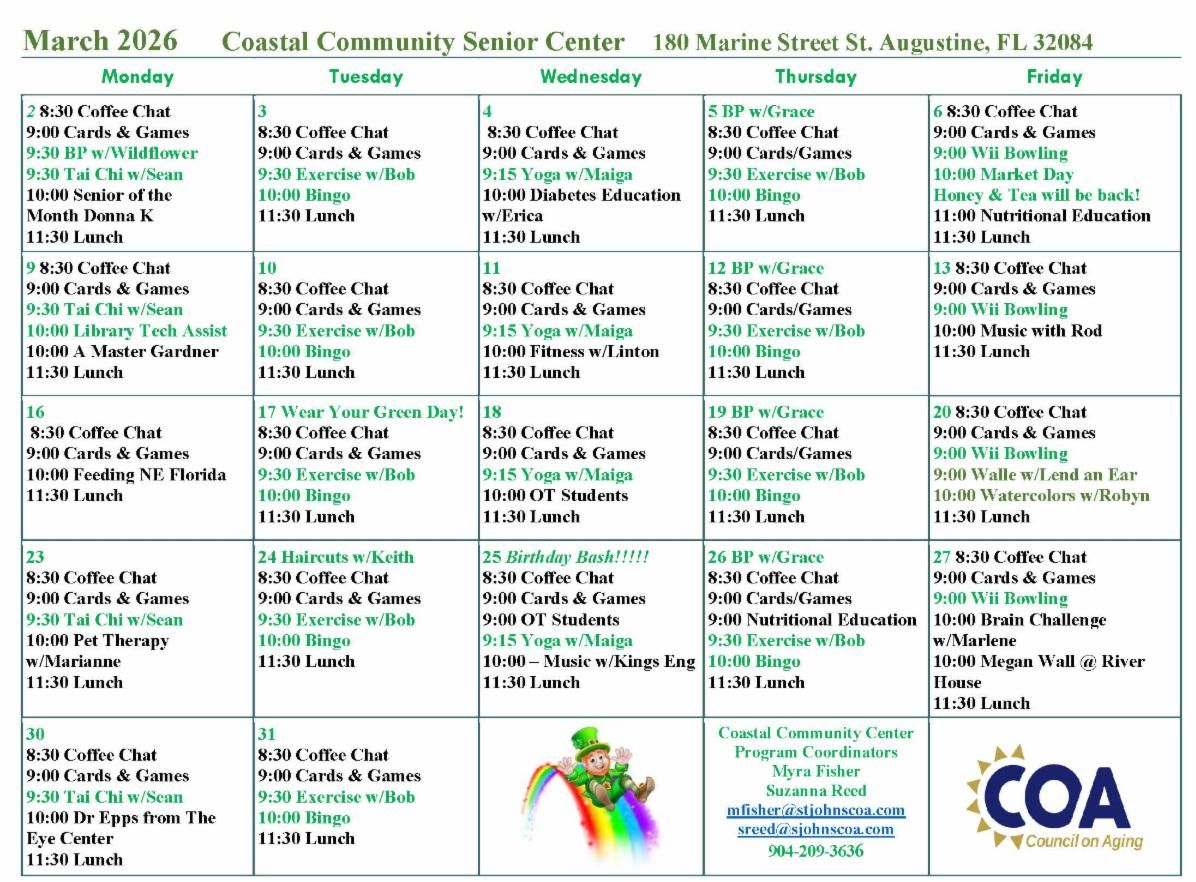 Take advantage of these opportunities to fill your free hours while helping others and making a difference in their lives! To download a volunteer application, visit our website at www.coasjc.org/volunteer. For more information or to schedule your interview, please contact COA's Volunteer Coordinator Catherine Quintieri at volunteer@coasjc.org or 904-209-3686.