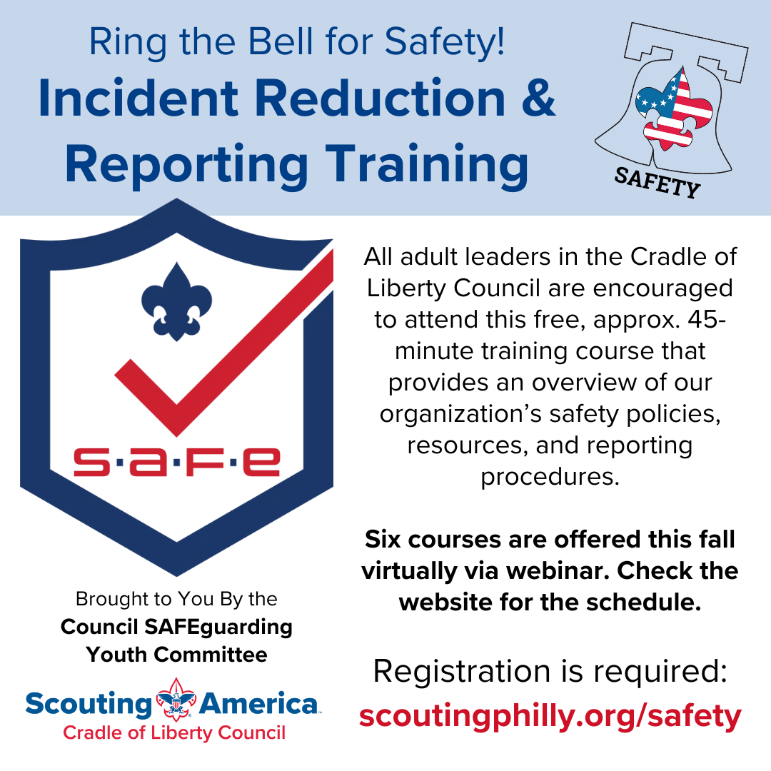| | All adult leaders in the council are encouraged to take Incident Reduction and Reporting Training. This free, approx. 45-minute course provides an overview of our organization’s safety policies, resources, and reporting procedures. Six Zoom webinar sessions are being offered this fall – registration is required. Leaders who have previously completed this course don’t need to retake it to count for Ring the Bell recognition this year. | | | | Sousa Bowl Trap Shooting Fundraiser - Nov. 8 | |