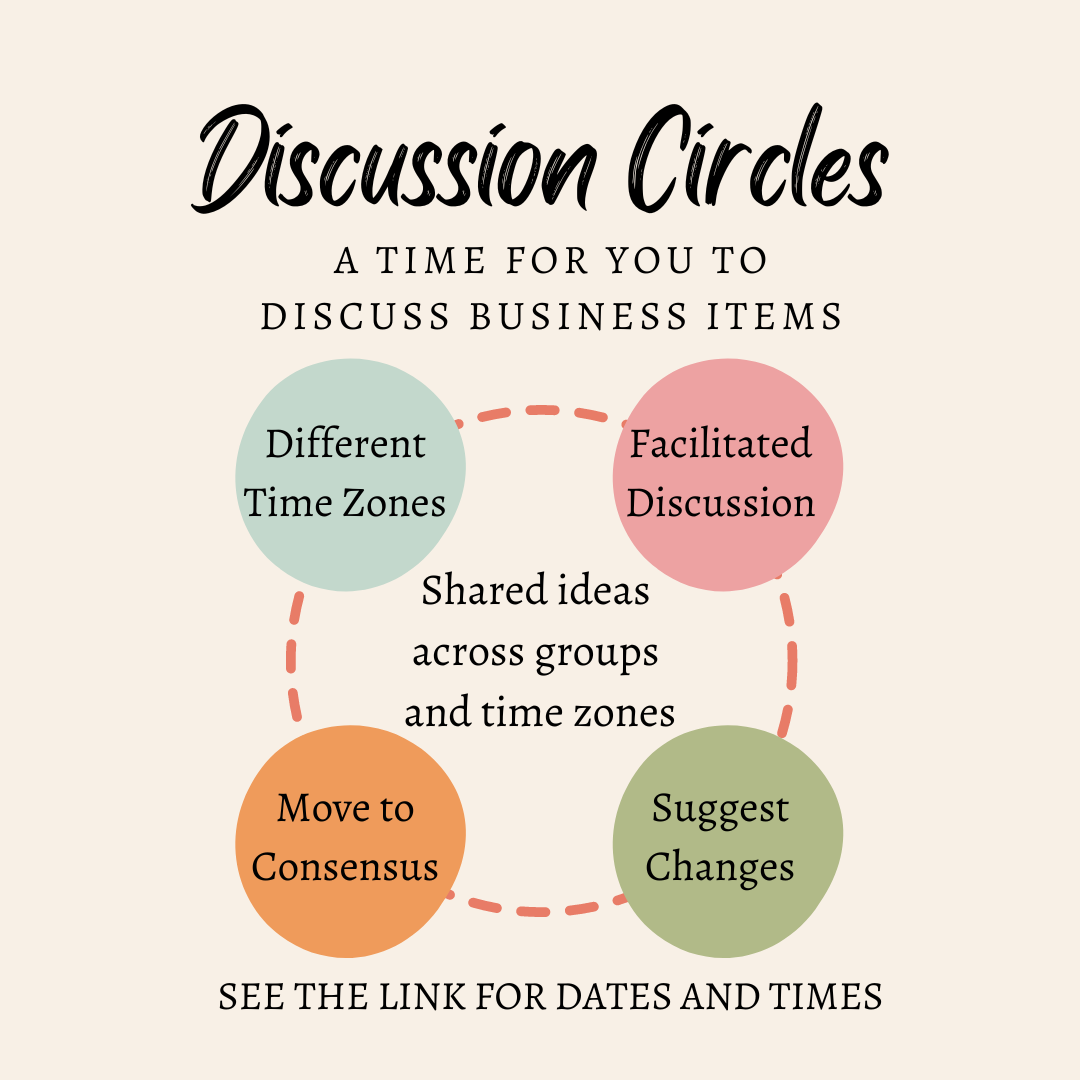 Join in a facilitated conversation ahead of the Business Forum and Business Meeting. These Circles are a time to ask questions and suggest changes. Your ideas will be passed on to the authors of the motions or reports. Any modifications they make to the original will be presented at the Business Forum. This is an opportunity to move us towards consensus as we come to General Conference Business.