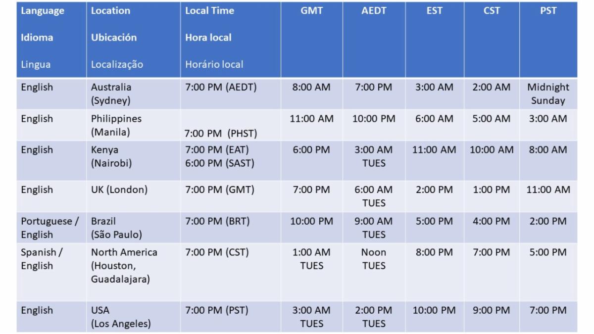 The Council of Elders invites you to prayer on World Day of Social Justice. Check the chart below for times and language. The location and local time reflects the target area however you may attend any session that works for your schedule. Just look across the chart to figure out the time in your time zone.