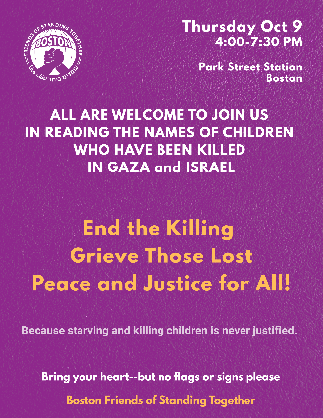 All are welcome to join us in reading the names of children who have been killed in Gaza and Israel.