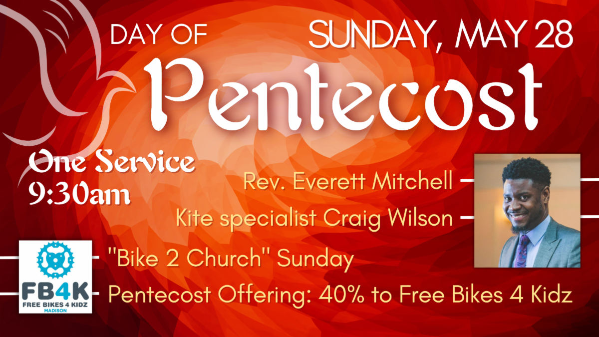 PS - In just over a week on May 28, don’t forget to wear something RED for Pentecost. And remember that’s when we go to a single 9:30 service for the summer. This Sunday, May 21, we have worship at 9:00 and 11:00. | |