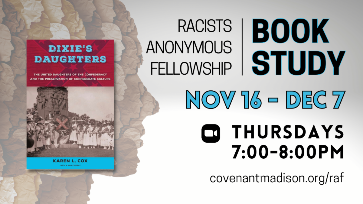 Racist Anonymous Fellowship's next book study is a 4-week study on "Dixie's Daughters" by Karen L. Cox (2019 edition) beginning on November 16 on Zoom. If you are curious to know why and how so many Confederate monuments were built after the Civil War and why the myth of the "Lost Cause" became so entrenched in the South, this book is very enlightening. Email Jennifer Morgan for more information or for the link to the Zoom meeting. | |