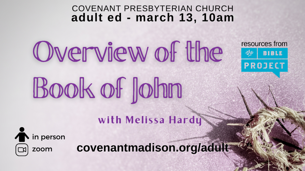 Join us Sunday at 10:00am in person OR on Zoom for Adult Education! Sunday’s class is “An Overview of the Book of John” led by Melissa Hardy. This Lenten Season, we are focusing on the book of John. Please join us for an overview of the book using resources from The BibleProject, a non-profit animation studio that produces short-form, fully animated videos to make Bible stories accessible to everyone.