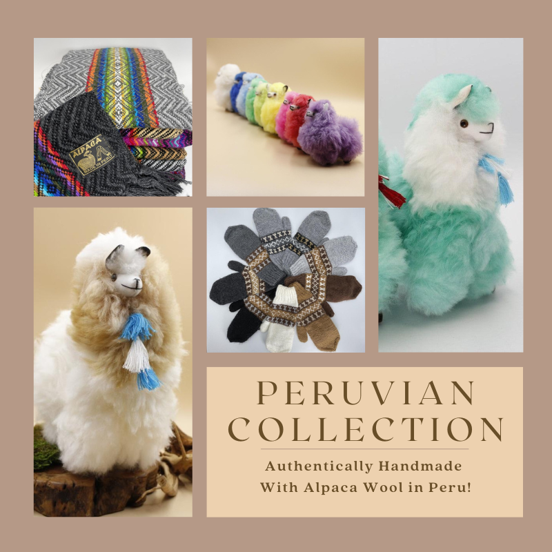 In Peru the beauty of Nature is treasured and easily found in its many landscapes. To preserve the natural beauty of their country, many Peruvians make unique products from Alpaca Wool, a renewable resource, without using synthetic chemicals. Alpaca Wool is harvested once a year during spring or summer time, when their climate is fresh from the rain and vegetation is plentiful. Harvesting during this time allows the animals to get plenty of water and nutrients to grow new, luscious wool for next year. Once harvested, the Alpaca Wool is turned into yarn they can weave, knit, or crochet into beautiful scarves, hats, gloves and even Stuffed Animals. With their connection to Nature, traditions of coloring the Alpaca Wool with locally sourced plant- and mineral-based dyes is only natural!