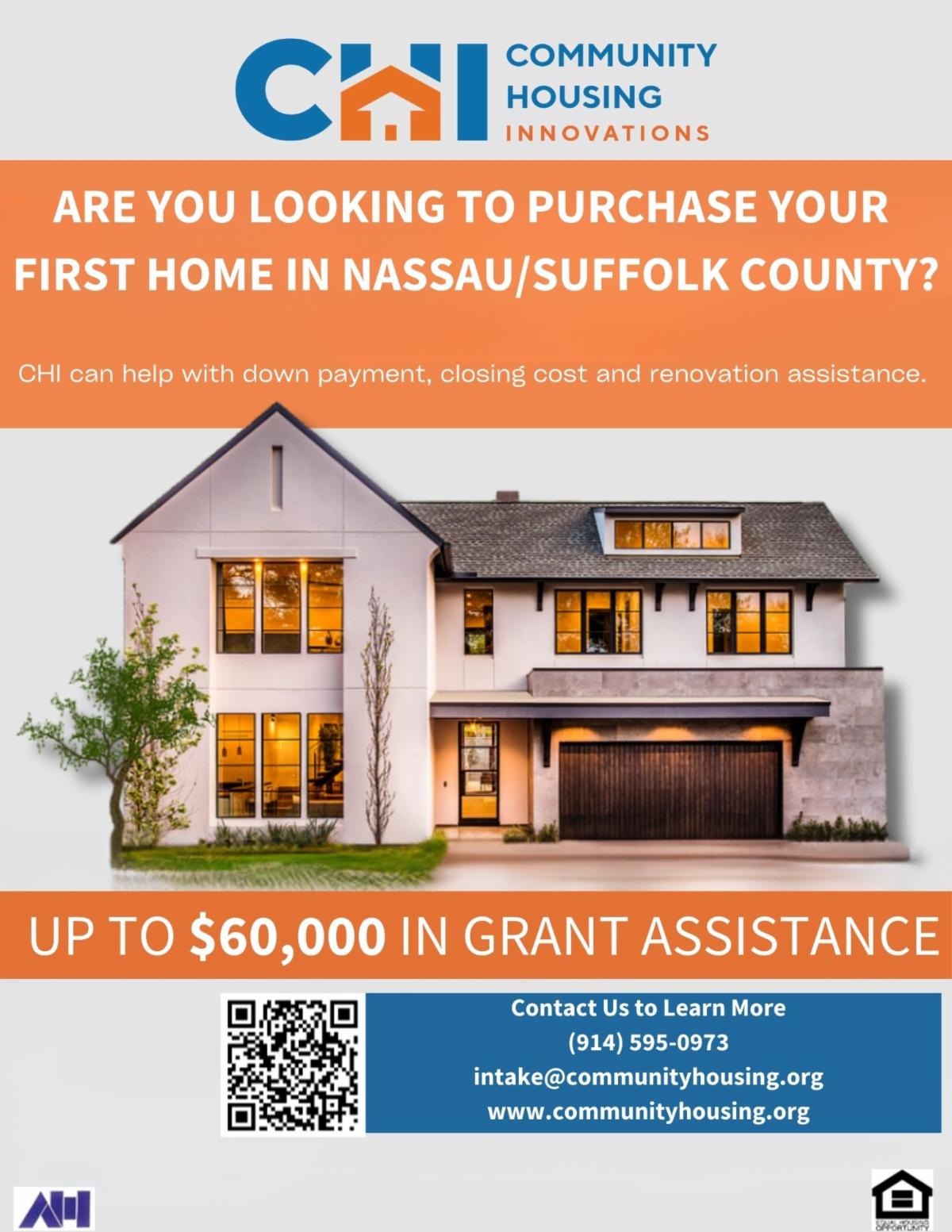 Are you looking to purchase your first home in Nassau or Suffolk County? Community Housing Innovations can help with down payment, closing cost, and renovation assistance in up to $60,000 in grant assistance. Contact them today to learn more by calling 914-595-0973 or email intake@communityhousing.org
